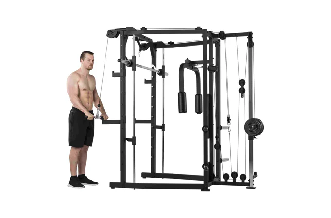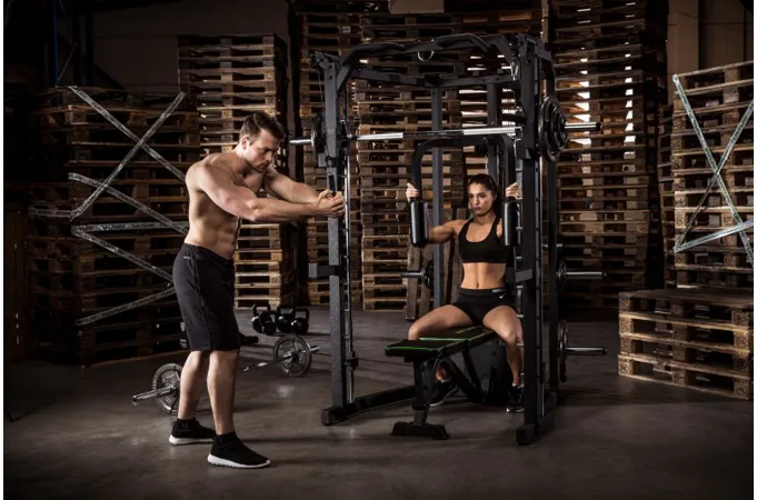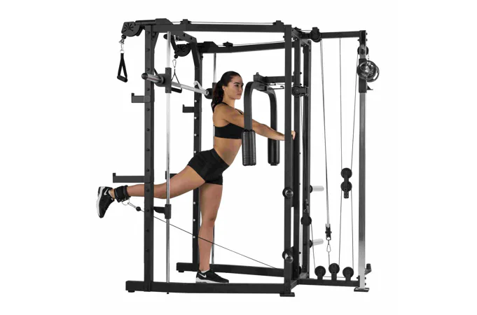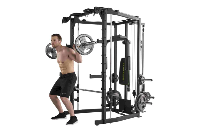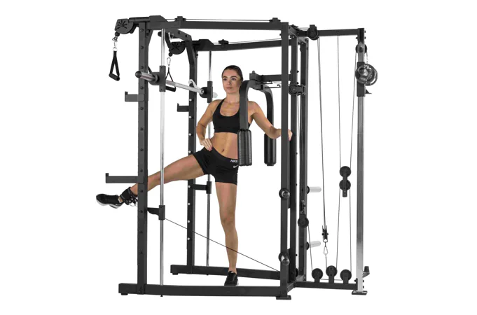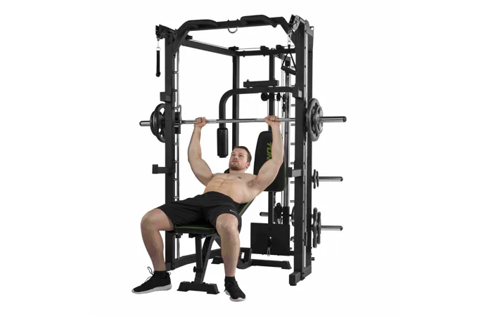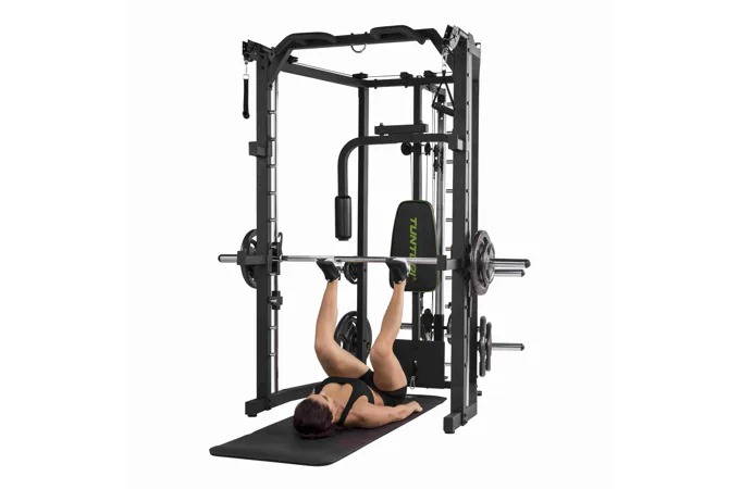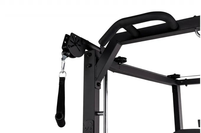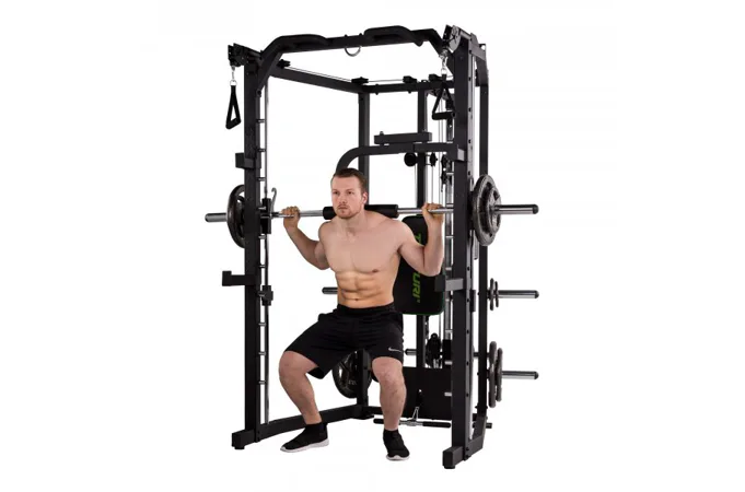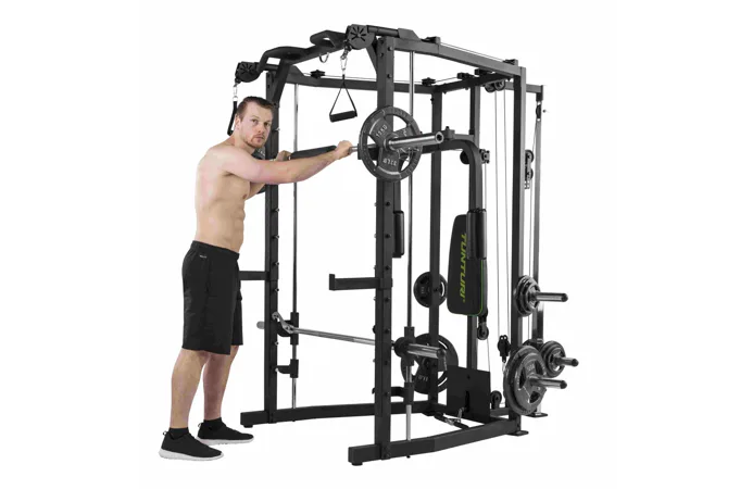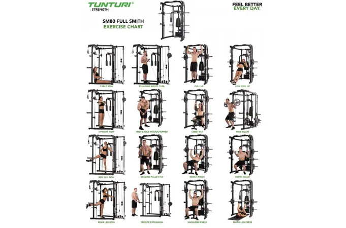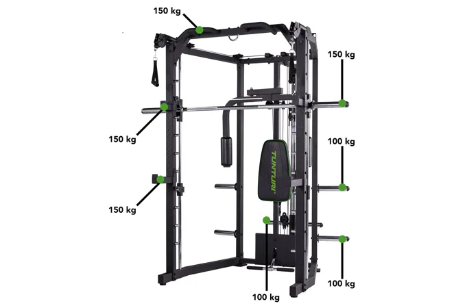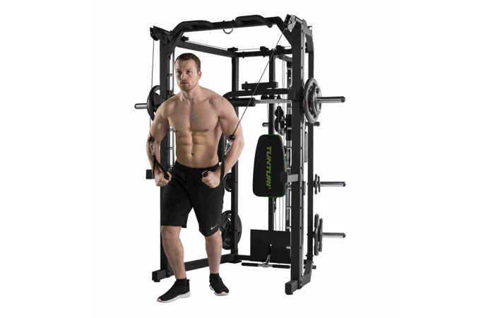Konstrukce TUNTURI SM80 Full Smith je universální posilovací stroj určený jak pro nenáročné domácí cvičení. Praktická kombinace klasické stojanové konatrukce s hrazdou, multipressu a kladek umožňuje procvičení desítek cviků na všechny svalové partie. určená pro veškeré cviky s činkami, či osou zabudovanou v konstrukci mulipressu.