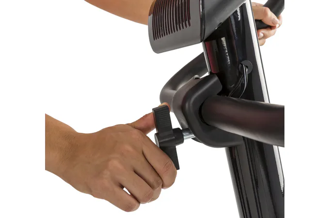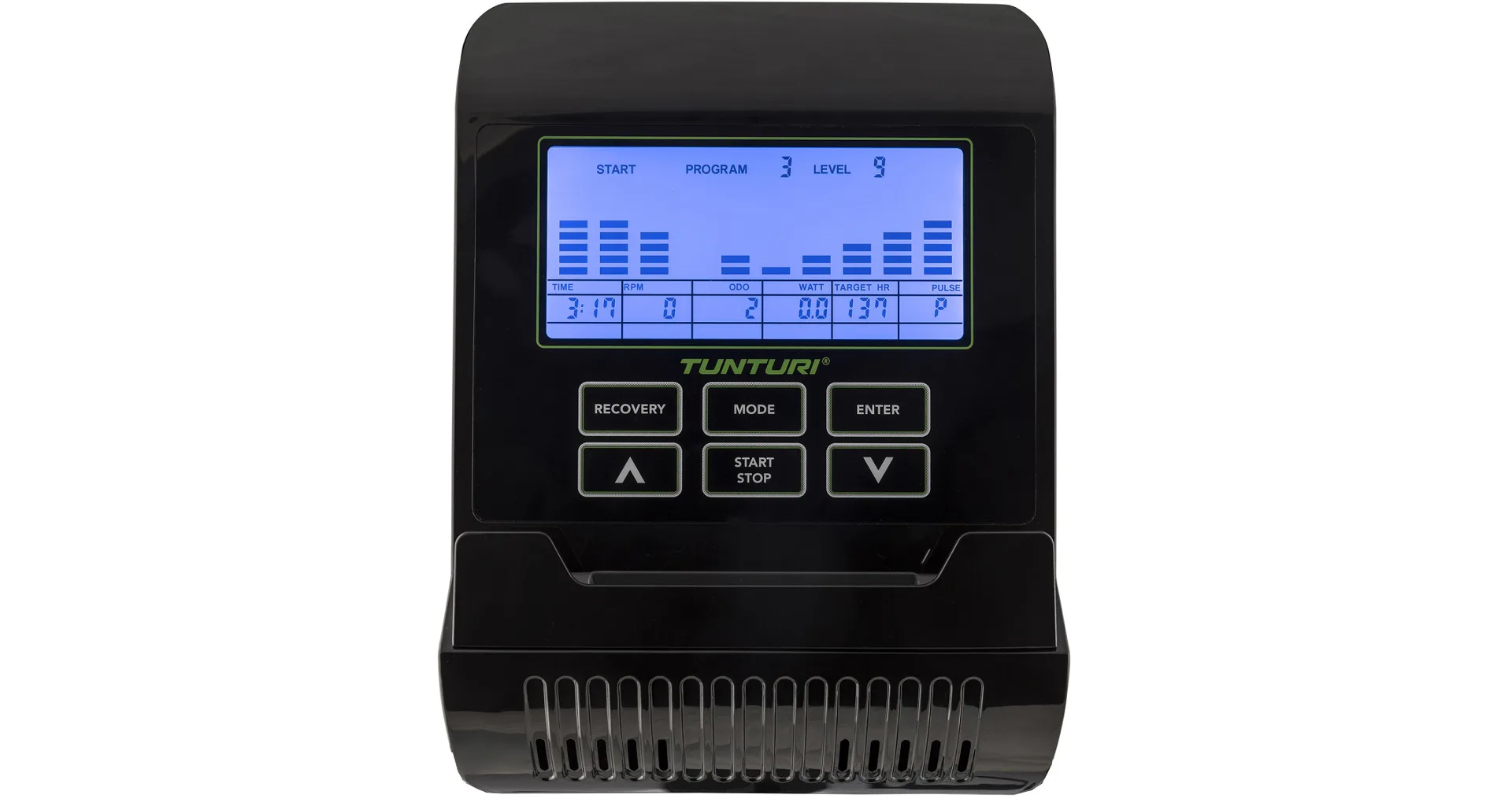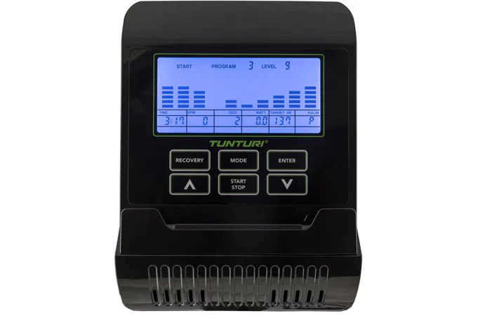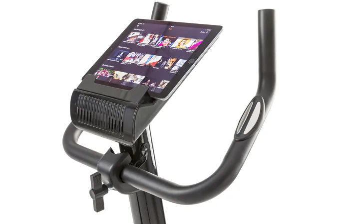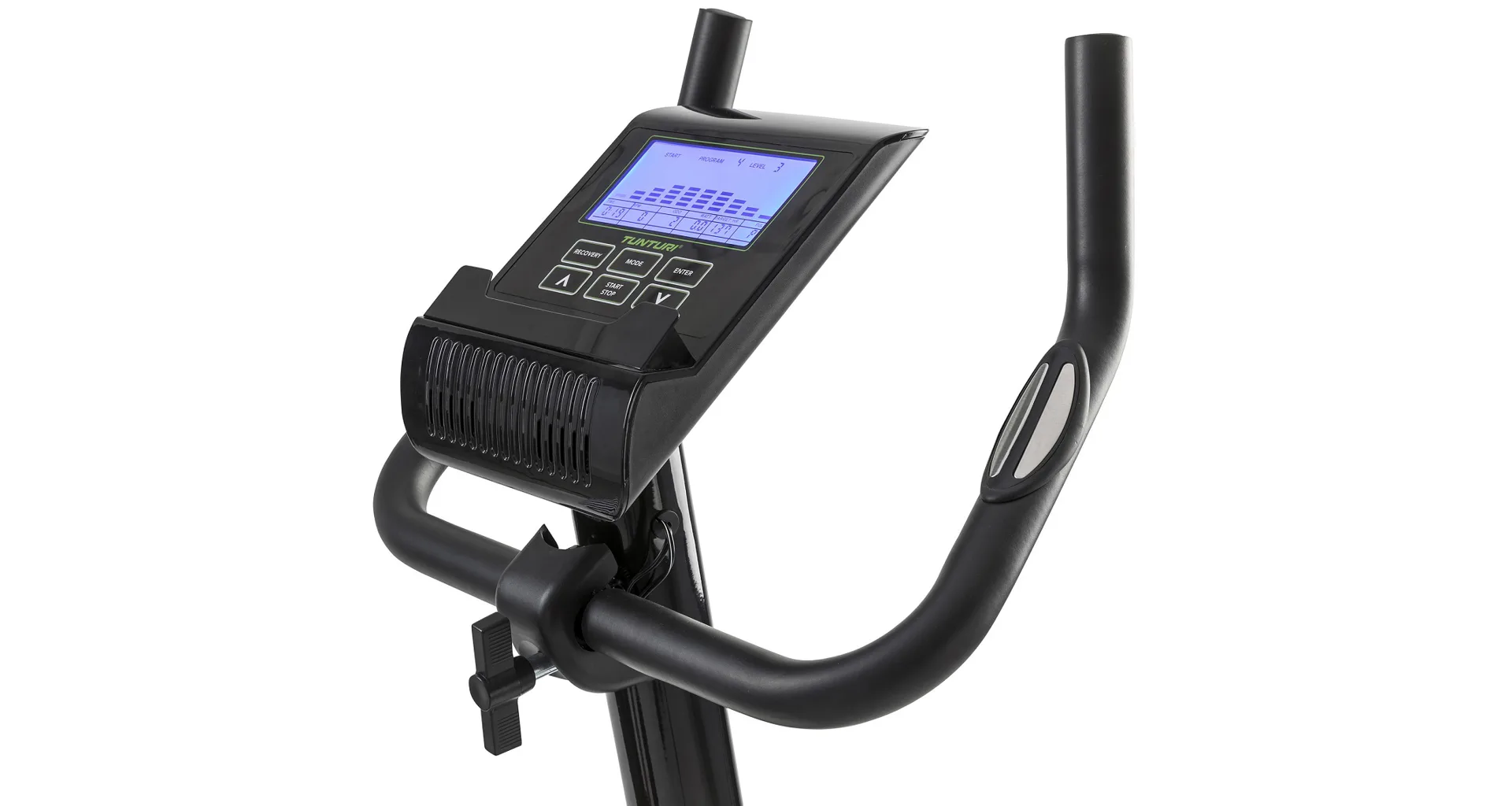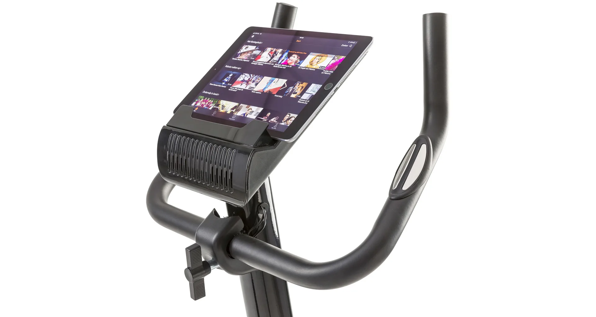 Tunturi StarFit E100 je vybaven počítačem, držákem na tablet, transportními kolečky, vyrovnávači nerovnosti a držákem na lahev.