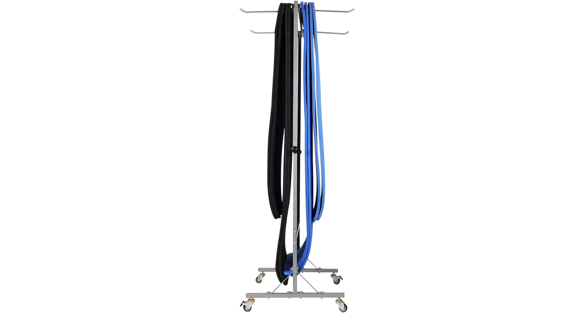 Stojan na podložky pojízdný TUNTURI Mat Transport Rack je ideální pomůckou pro zavěšení podložeks přídavnými oky. Díky tomuto stojanu mohou být podložky zavěšeny a nemusí být pracně rolovány. Háčky na podložky jsou nastavitelné, nosnost stojanu je do 20 kg. Velkým plusem jsou kolečka ve spodní části stojanu, díky kterým je velmi snadné přesunout stojan z jednoho bodu do druhého.