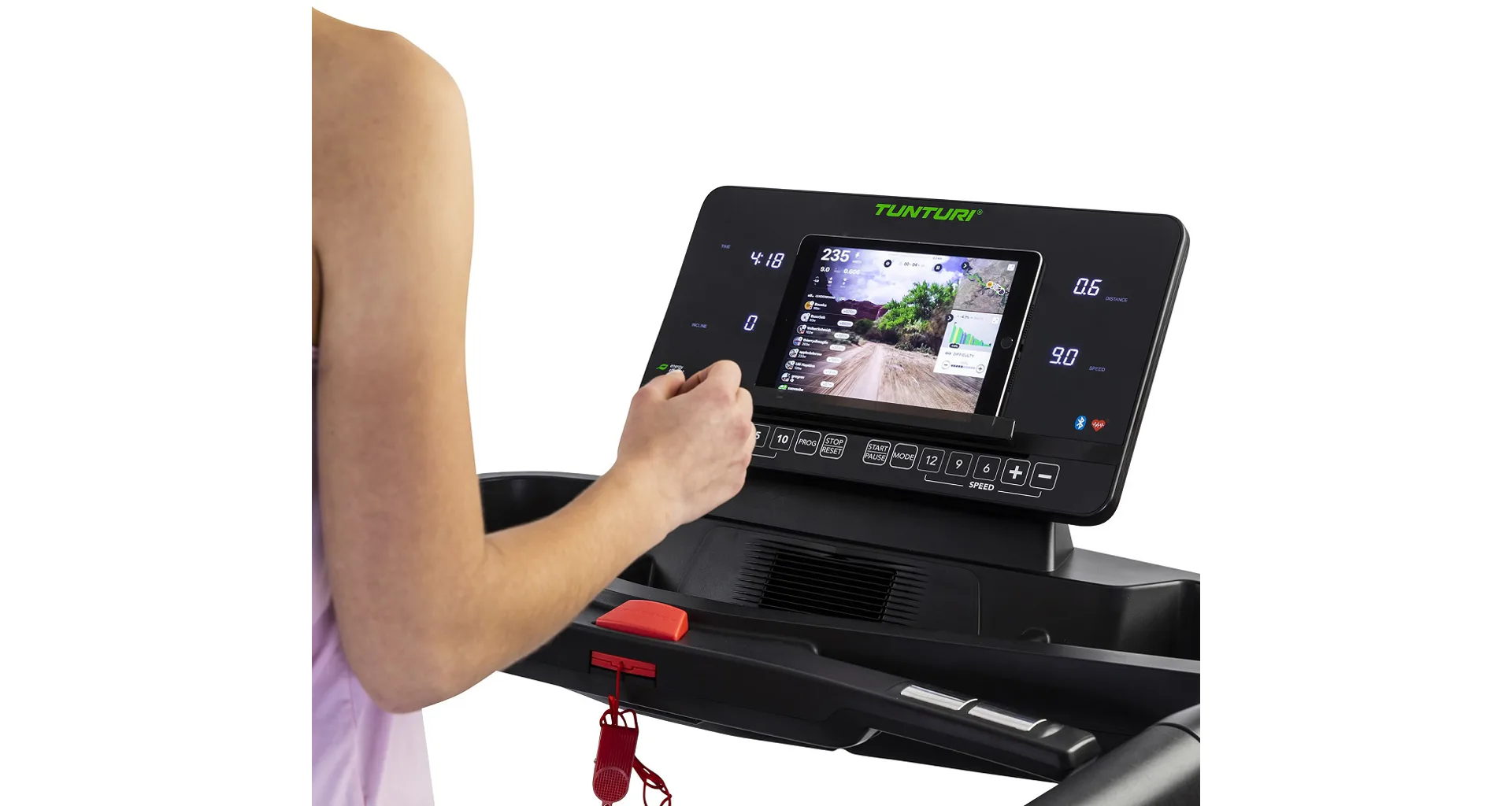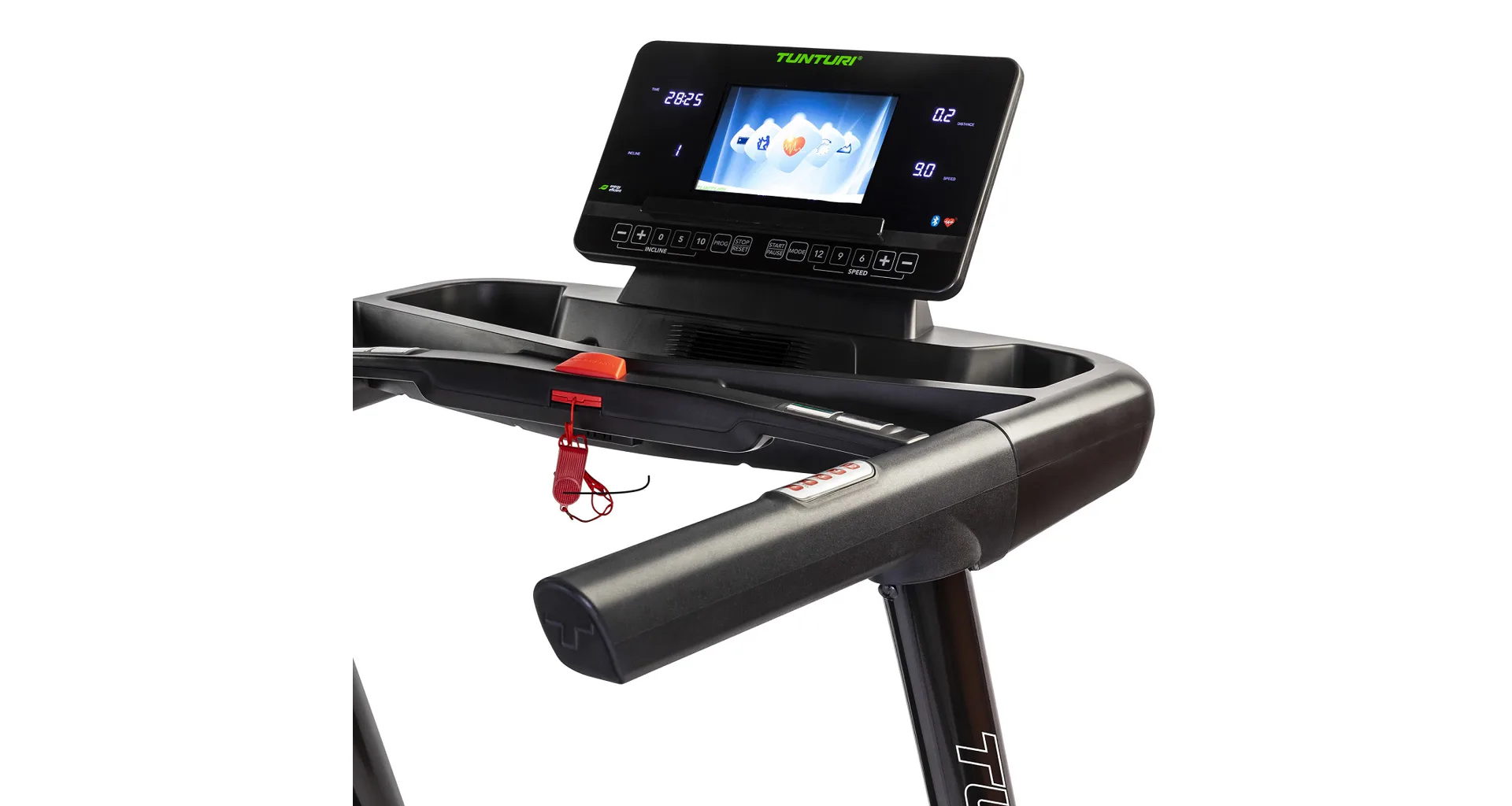 Součástí běžeckého pásu Tunturi T85 Endurance je počítač s barevným displejem, řadou programů a možností připojit tréninkovou aplikaci, transportní kolečka, vyrovnávače nerovnosti a 2x držák na lahev.