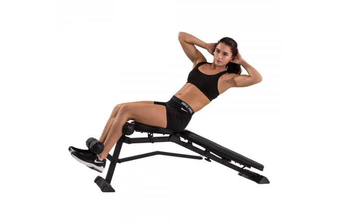 Lavice je určená pro cviky s činkami nebo ji lze využít na procvičení břišních svalů, díky zaráčce na nohy.