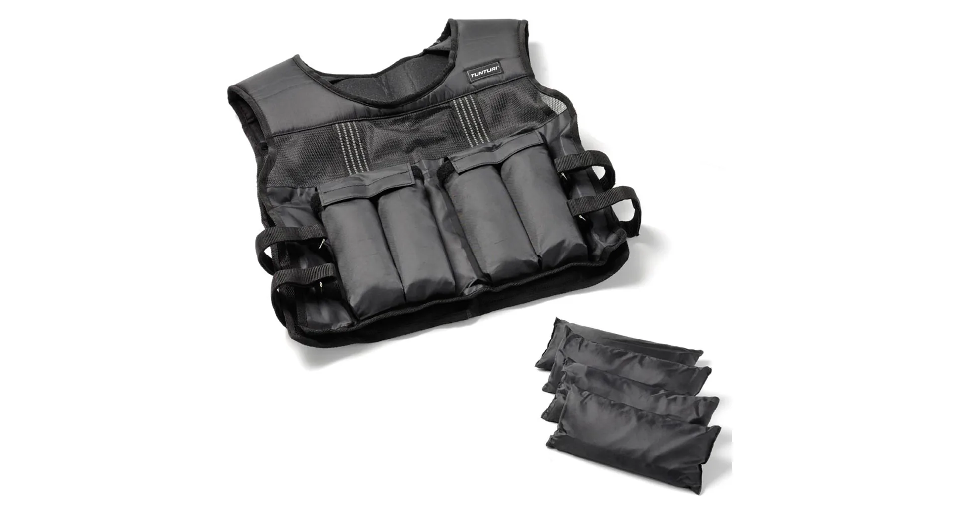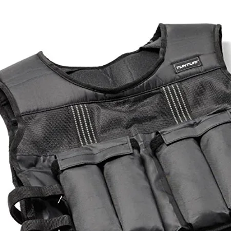 Zátěžová nylonová vesta od značky TUNTURI se zátěží 15 kg je praktická pomůcka s variabilní hmotností. Povrch vesty tvoří pohodlný nylon, výplň pak představuje 8 segmentů plněných jemným pískem (jeden váží 1,875 kg). Pruh síťoviny vpředu i vzadu napomáhá lepší prodyšnosti vesty. Pro přizpůsobení velikosti dle postavy a pro lepší fixaci vesty slouží dva pásy na suchý zip na každé straně. Zátěžová vesta nachází uplatnění při běhu, cvičení s vlastní hmotností a dalších disciplínách. Cvičení s vestou zvyšuje dynamiku, vytrvalost i aerobní kapacitu.