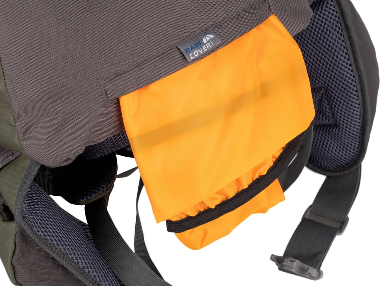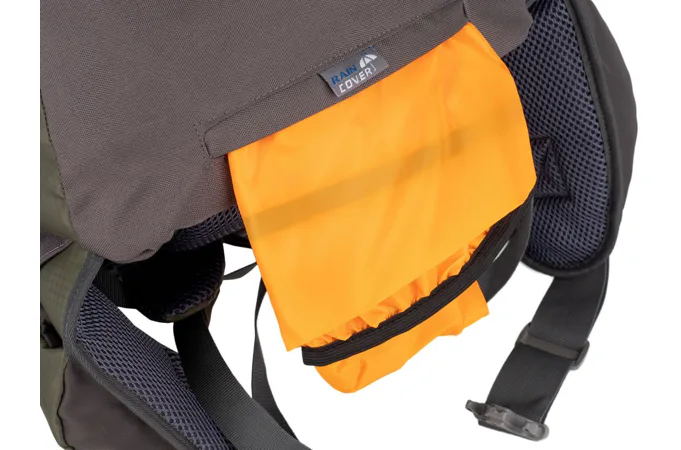 Důležitou součástí výbavy je nepormokavá pláštěnka na batoh, která je uložena v kapsičce na zip ve dnu batohu a je přístupná zvenku dle potřeby. Navlékací pláštěnka se stahovací gumou je vyrobená z 210T voděodolného PES na ochranu batohu před vlhkostí.