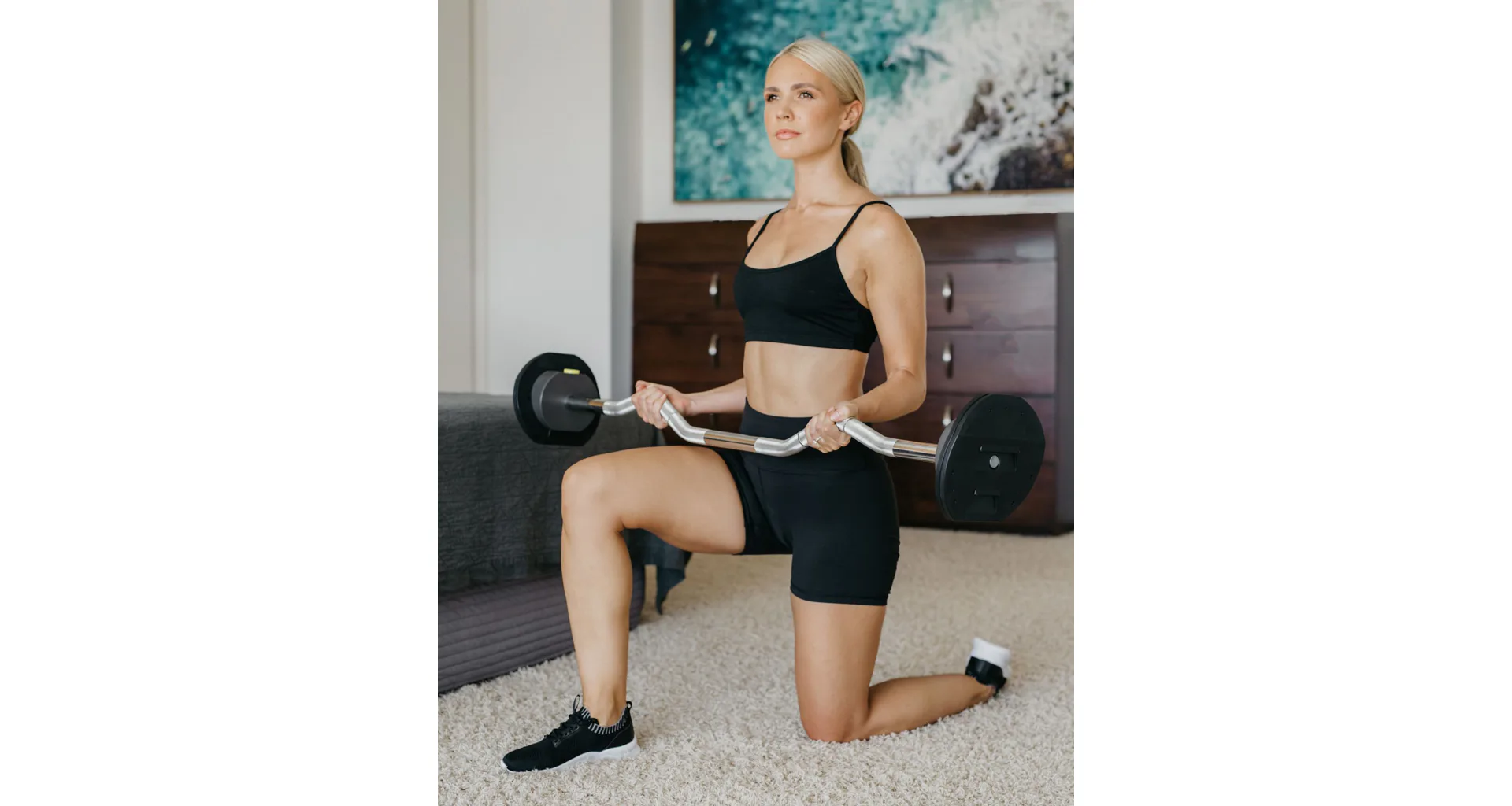 Sada obsahuje rovnou tyč, tyč EZ-curl, 45,3 kg závaží a elegantní, kompaktní úložný stojan.