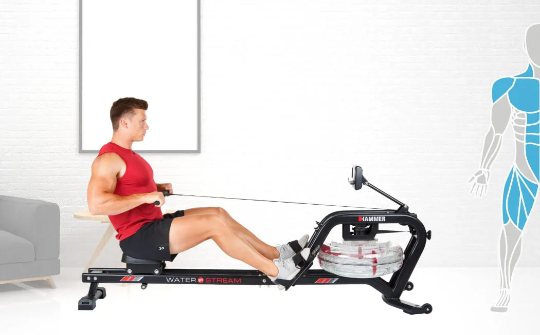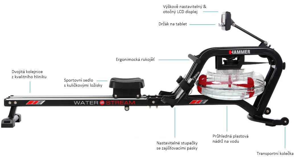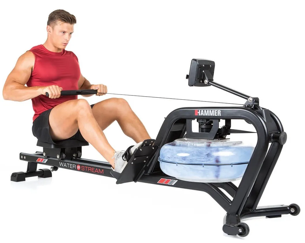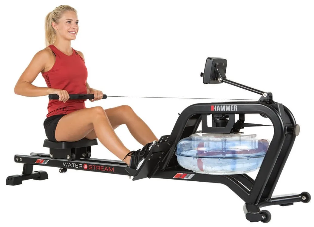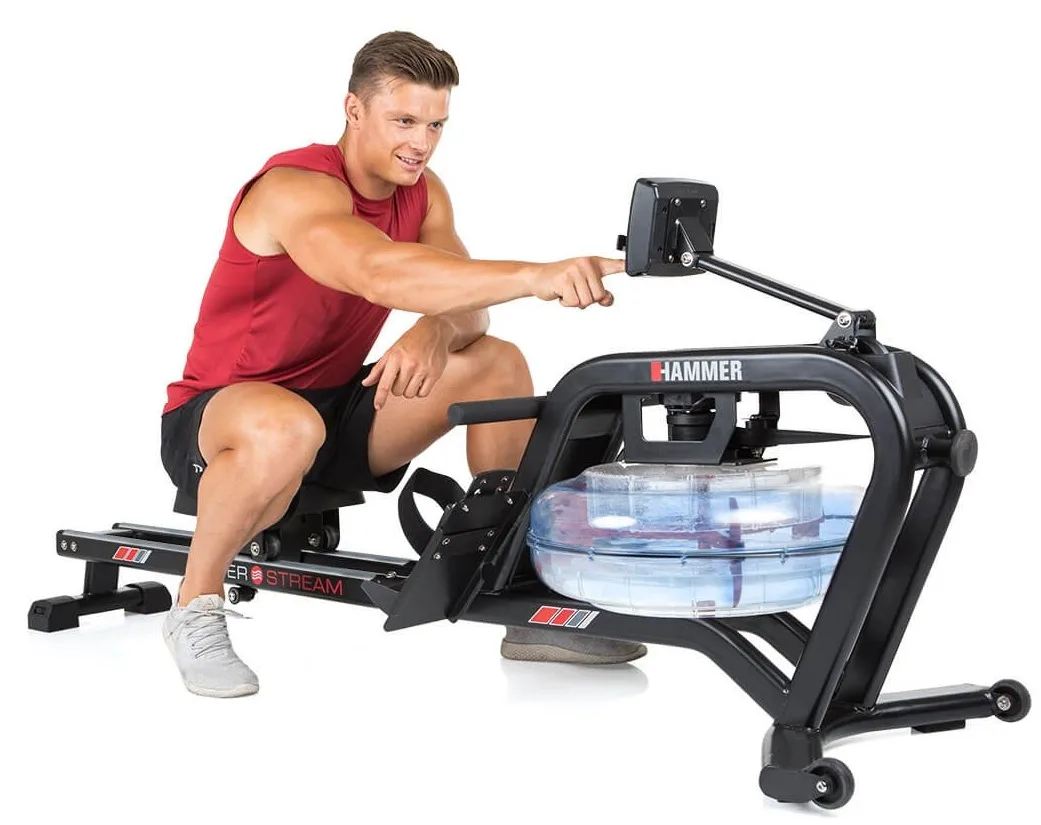 HAMMER Water Stream je veslovací trenažér s odolnou rámovou konstrukcí vhodný do domácího prostředí. Vyniká především odporem vytvářený vodou a naprosto věrohodně tak simuluje veslování ve vodě.