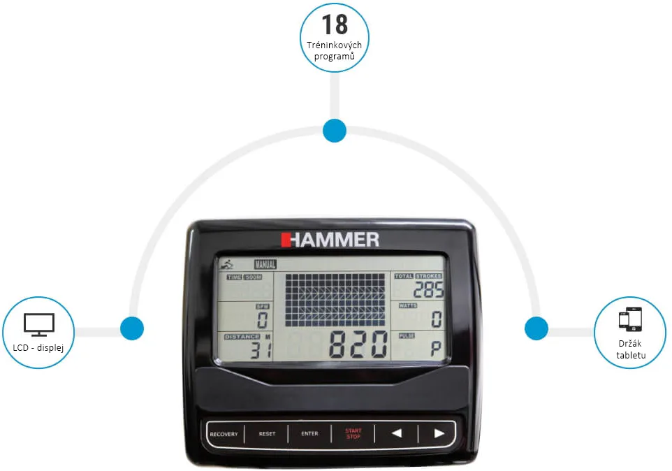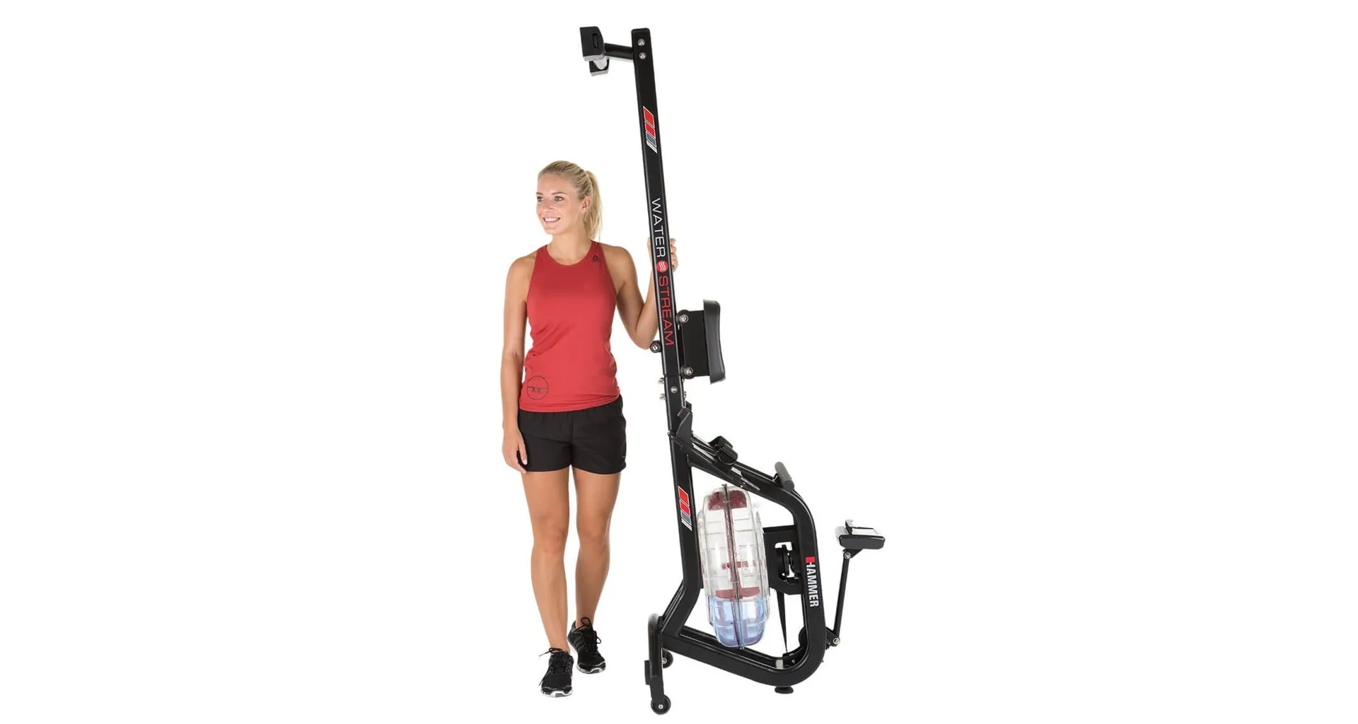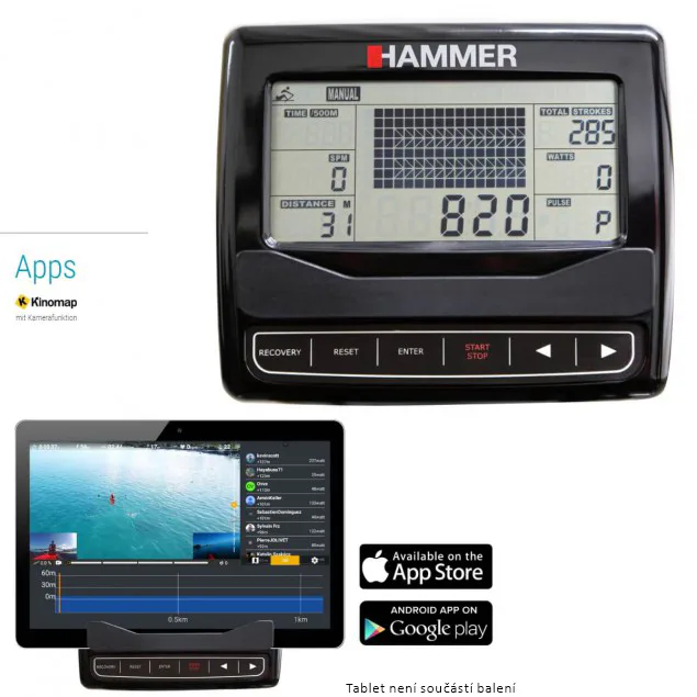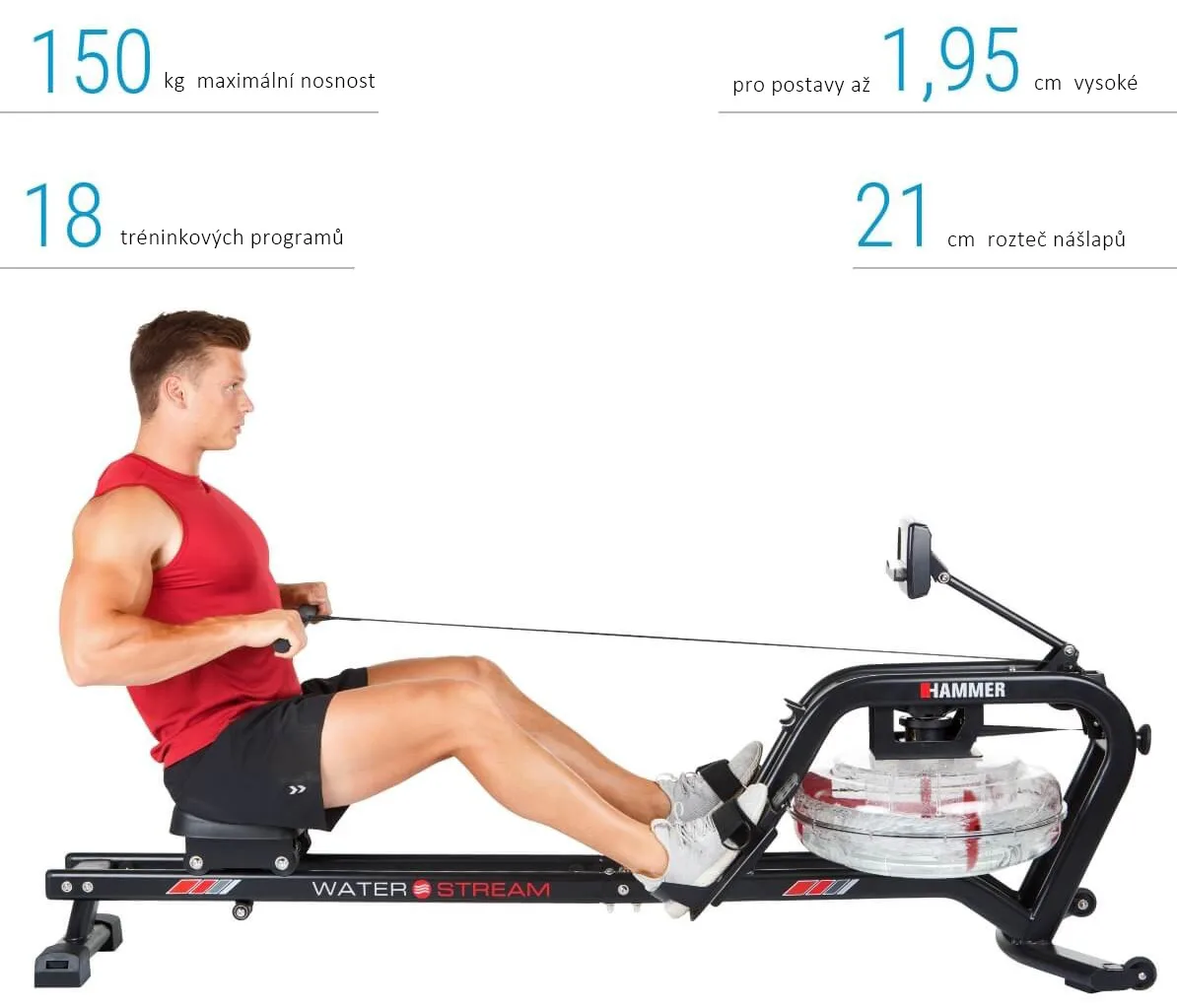 HAMMER Water Stream je veslovací trenažér s odolnou rámovou konstrukcí vhodný do domácího prostředí. Vyniká především odporem vytvářený vodou a naprosto věrohodně tak simuluje veslování ve vodě.