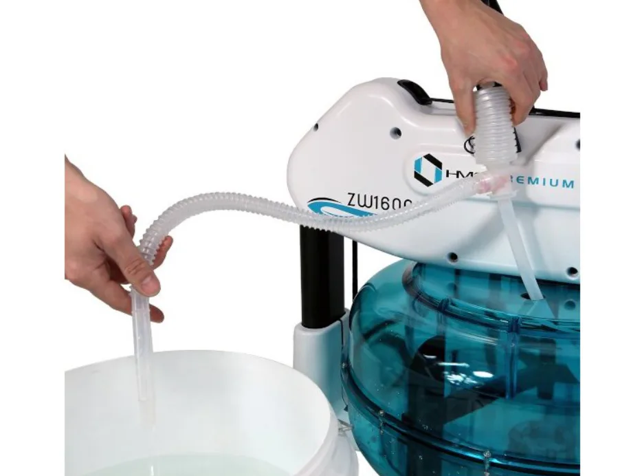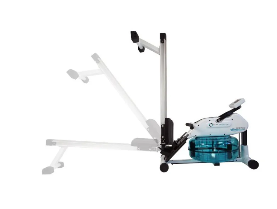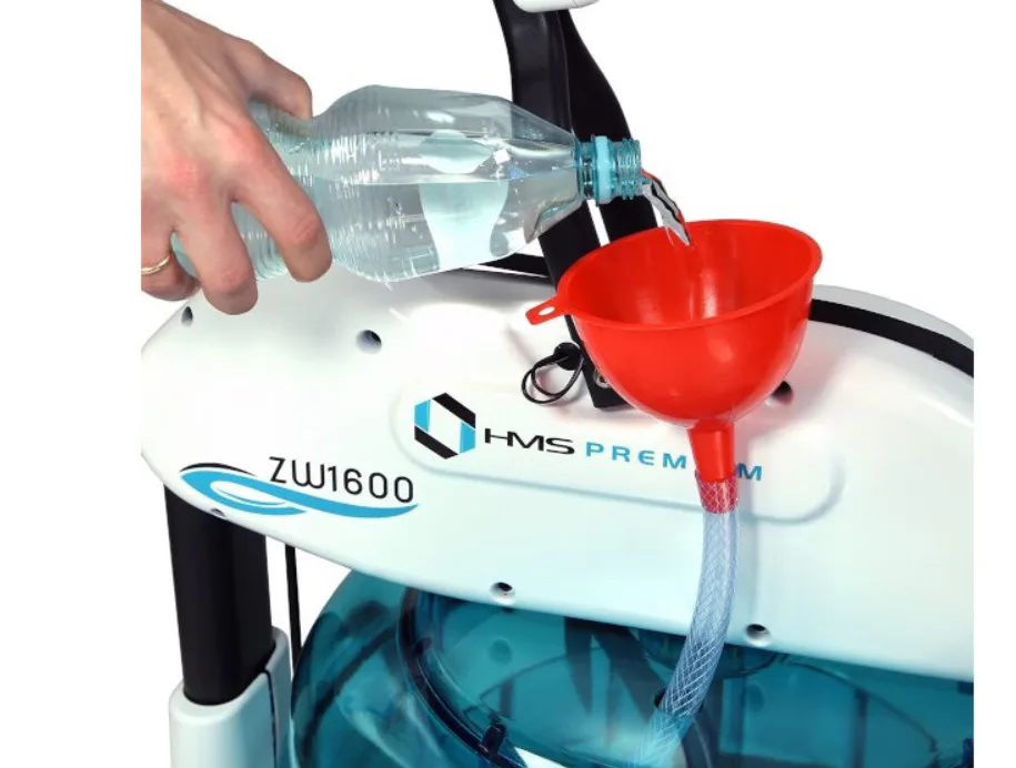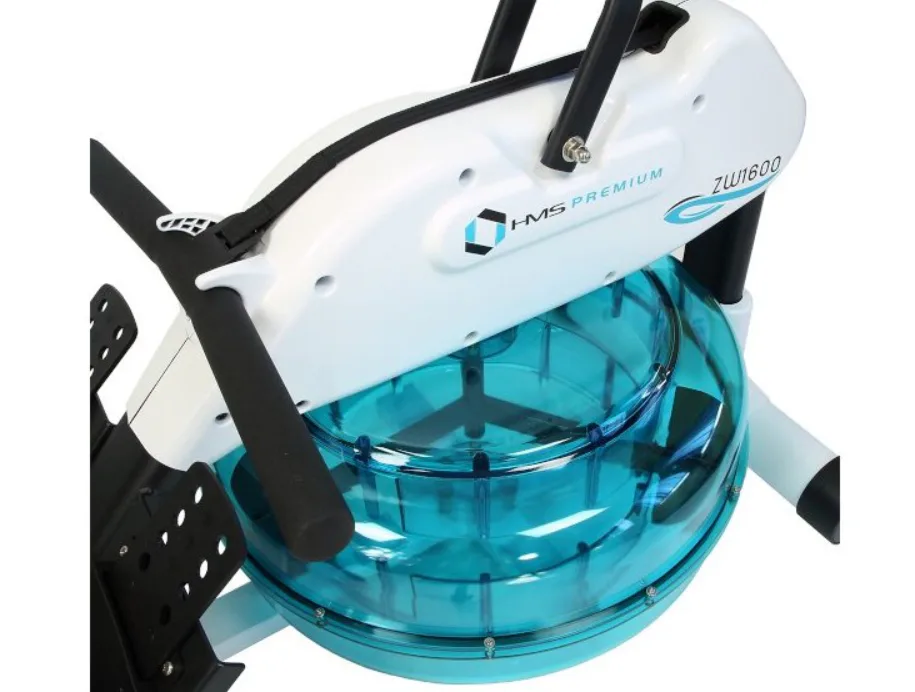Vodní veslařšký trenažér ZW1600 HMS Premium je vybaven nádrží pro napouštění (ideálně destilovanou) vodou. Výška její hladiny nám určuje odpor během cvičení. Lopatky v nádrži jsou pod ideálním úhlem pro maximální plynulost pohybu. Mechanický zvuk odporového kola u klasických modelů je u našeho stroje ZW1600 nahrazen příjemným šuměním vody. Pro úpravu výšky hladiny je součástí balení trychtýřek s hadicí a pumpička.