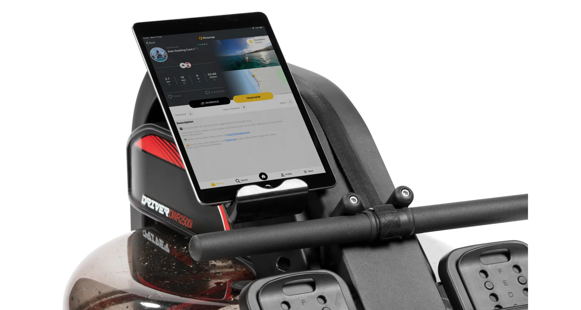 Veslo Flow Fitness DWR2500i také disponuje přehledným počítačem s držákem na tablet/smartphone, transportními kolečky, vyrovnávači nerovnosti a možností sklopení do vertikální polohy.