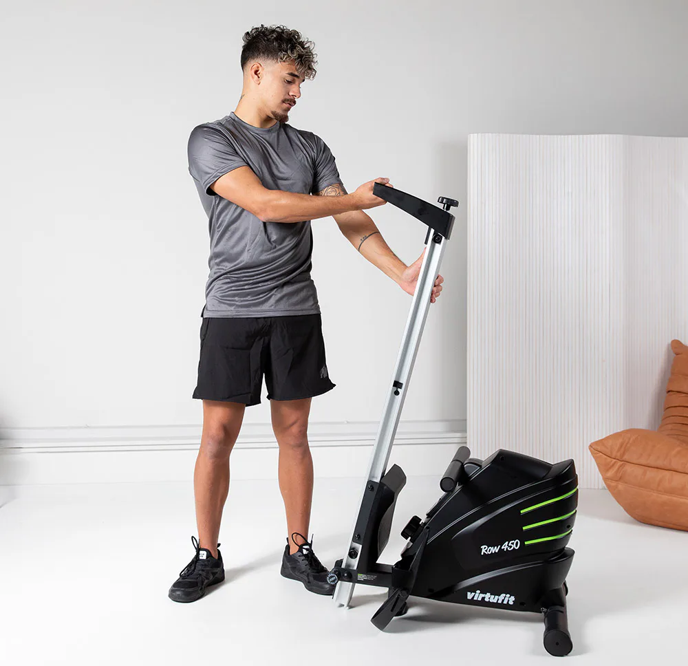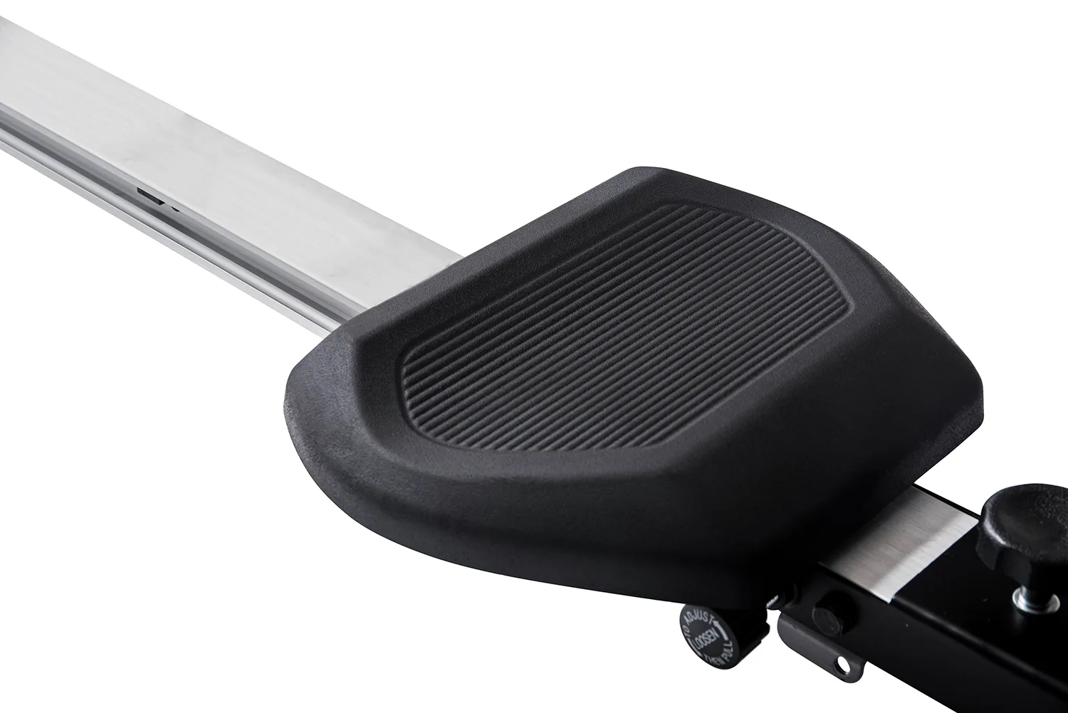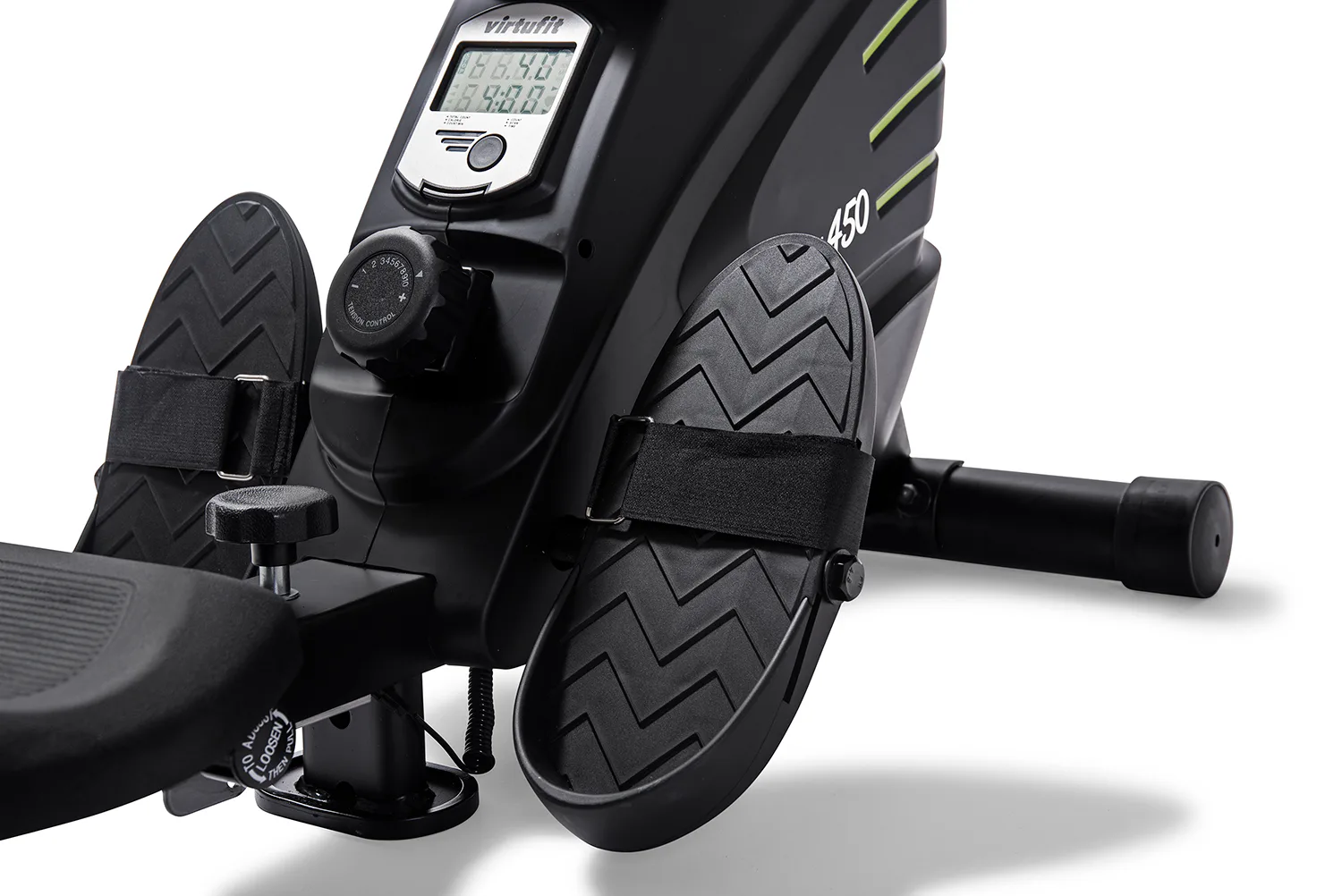Pohodlnou polohu a pocit při veslování zajišťuje široké, ergonomicky tvarované sedlo a protiskluzové nášlapy s řemínky pro správné zafixování nohou. VIRTUFIT Row 450 nabízí sklopení pojezdové části, což výrazně usnadňuje skladování zejména v menších prostorech.