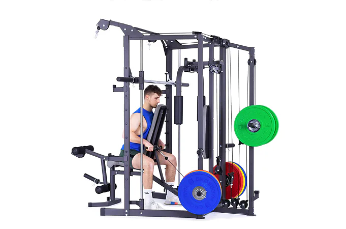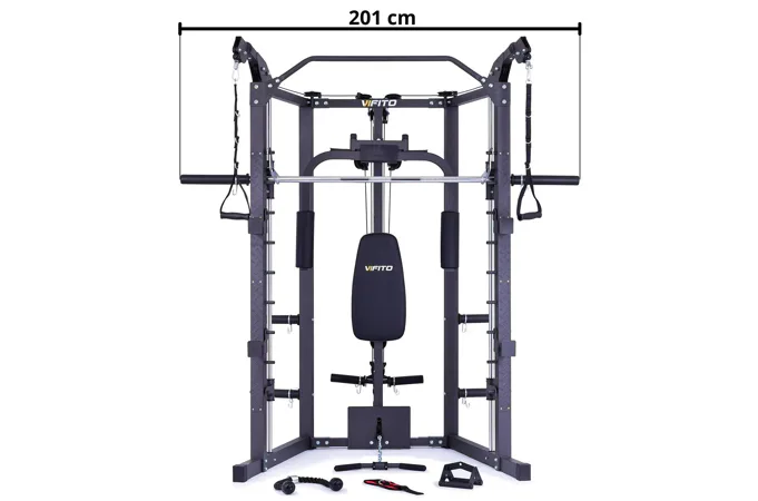 Univerzální multipress VIFITO Omega S40 pro náročné. Díky svým rozměrům (d x š x v): 165 x 201 x 215 cm vám bude stroj zabírat okolo 4 m2. Proto je tento kombinovaný multipress ideálním řešením do domácí posilovny. Rozměry samotné základny stroje jsou (d x š): 150 x 90 -140 cm.