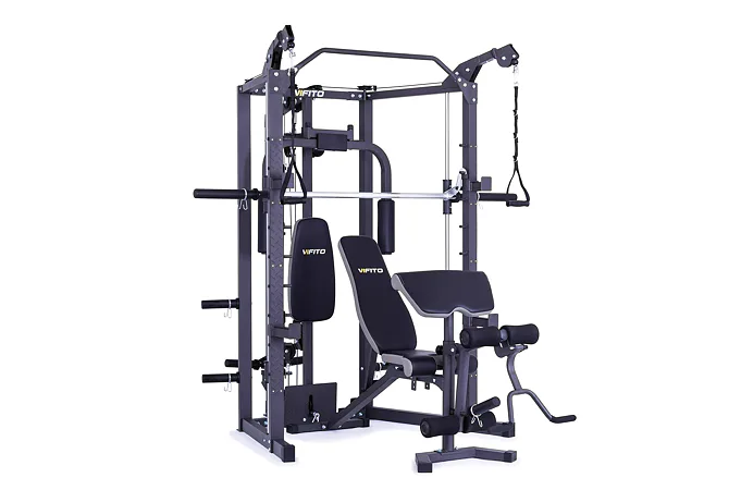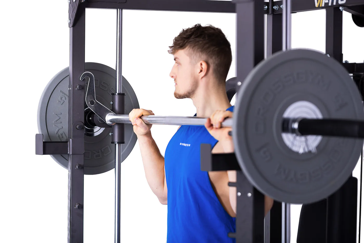 VIFITO Omega S40 má masivní ocelovou konstrukci, kde můžete zvolit výšku vedené osy multipressu pro daný cvik v 9 polohách podle potřeb každého z vás. Průměr nakládacích trnů chromované osy lze zvětšit z 25 mm na 50 mm (olympijské), díky standardně dodávanému adaptéru. Což vás neomezí v libovolném výběru kotoučů s vrtáním 25, 30 nebo 50 mm. Váhu si zvolí každý podle svých sil a potřeb.