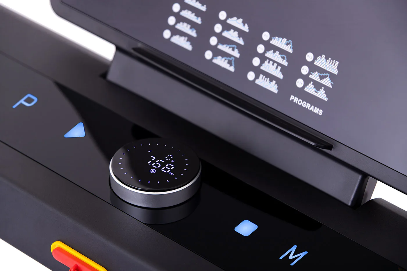 Specialitou tohoto modelu je druhý mini displej ve tvaru hodinek, který se nachází na hlavním panelu s tlačítky. Nejen, že jde o skvělý designový doplněk, ale zároveň funguje jako tlačítko. Jeho otočením můžete regulovat sklon, případně rychlost a jeho stisknutím zastavíte nebo pustíte běžecký pás.