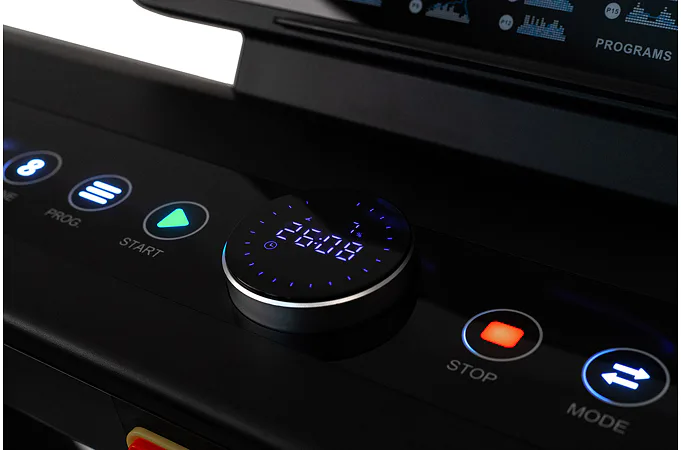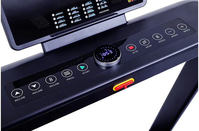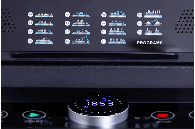 Rychlost běhu a sklon si můžete nastavovat během tréninku ručně tlačítky, případně si můžete si vybrat některý z 15 přednastavených tréninkových programů. Pro maximální efektivitu tréninku můžete využít měření tepové frekvence skrz dlaňové snímače tepové frekvence.
