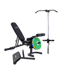 • multifunkční lavice s kopačem, bicepsovou opěrkou a kladkou