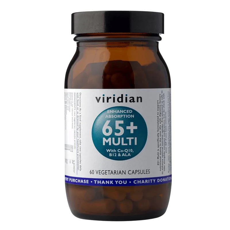 Viridian 65+ Multi 60 kapslí je doplněk stravy vyvinutý speciálně pro nutriční potřeby osob nad 65 let. Obsahuje komplex důležitých vitamínů B, B12, C, D, které jsou v tomto věku pro organismus velmi potřebné, komplex chelátově vázaných minerálů, komplex bioaktivních enzymů a řadu dalších aktivně působících látek. Díky výjimečnému složení lze doporučit i všem fyzicky aktivním osobám. Podporuje organismus sportovců i lidí v důchodovém věku.