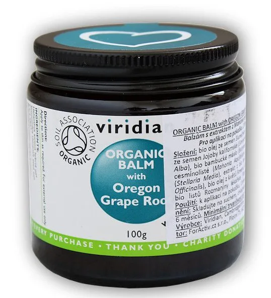 Viridian Balm with Oregon Grape Root je BIO balzám na pleť složený výhradně z přírodních účinných složek zaměřených na podporu pleti při problémech. Užívá se při atopickém ekzému, vyrážkách způsobených toxiny nebo bakteriemi, nebo při lupénce. Na rozdíl od běžných krémů a balzámů neobsahuje žádné syntetické složky a poskytuje tak 100% přírodní účinnou podporu.