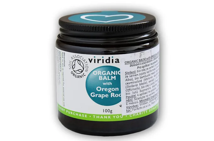 Viridian Balm with Oregon Grape Root je BIO balzám na pleť složený výhradně z přírodních účinných složek zaměřených na podporu pleti při problémech. Užívá se při atopickém ekzému, vyrážkách způsobených toxiny nebo bakteriemi, nebo při lupénce. Na rozdíl od běžných krémů a balzámů neobsahuje žádné syntetické složky a poskytuje tak 100% přírodní účinnou podporu.