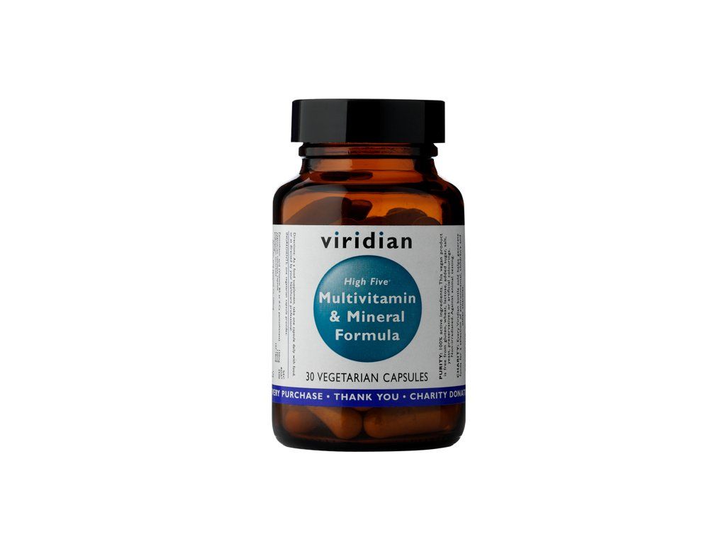 VIRIDIAN High Five Multivitamin and Mineral Formul je kvalitní směs vitamínů, minerálů a rostlinných extraktů, s vysokým obsahem vitamínu B1, B2, B3, B5, B12 a D3. High 5 Multivitamín obsahuje kompletní spektrum všech důležitých vitamínů, a to v těch nejúčinnějších formách a poměrech, směs je doplněna o silné antioxidanty jako je Beta Karoten, Kryptoxanthin, Alpha Karoten, Zeaxanthin a Lutein. Vybrané minerály jsou v exkluzivních formách chelátu. High 5 Multivitamín je sestaven pro běžné úžívání, zejména pro velmi aktivní, přetížené jedince jako jsou např. podnikatelé, ženy v menstruační periodě, starší lidé, vegetariáni, vegani, a další.