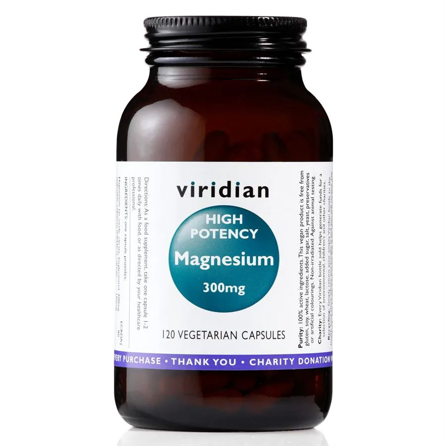 VIRIDIAN High Potency Magnesium obsahuje v jedné kapsli vysokou dávku hořčíku (300 mg = 80 % doporučené denní dávky) složenou ze tří forem – bisglycinátu hořečnatého, citrátu hořečnatého a oxidu hořečnatého. Tyto tři formy dohromady dávají velice efektivní synergní směs dobře využitelnou pro tělo.