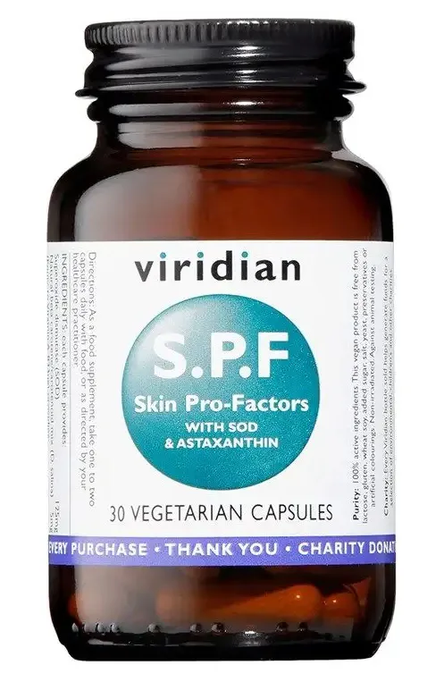VIRIDIAN S.P.F Skin Pro Factor je doplněk stravy obsahující směs velmi silných antioxidantů – superoxid dismutázy, extraktu ze semen vinných hroznů, směs beta karotenů z mořské řasy a astaxanthinu. Tyto látky působí synergně a jsou zaměřené primárně na oblast pokožky a škod způsobených nadměrným oxidačním stresem (pokožky i celého těla).