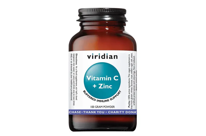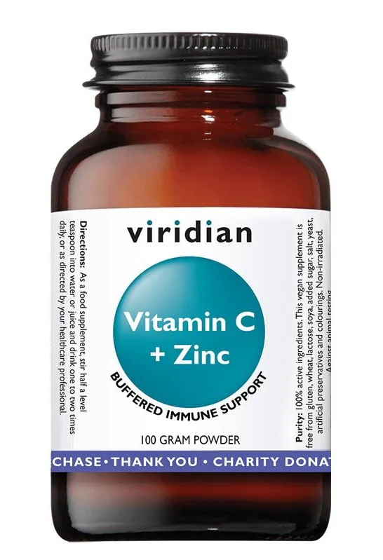 VIRIDIAN Vitamin C + Zinc poskytuje pufrovaný vitamín C - je obsažen ve třech formách askorbátu, které fungují jako pufr - zvyšují zásaditost a pomáhají vitamínu C projít přes kyselé prostředí žaludku. Doplněk v jedné dávce (1,7 g) obsahuje 1125 mg vitamínu C (1406 % RHP), 11 mg zinku (110 % RHP), 40 mg hořčíku (10,7 % RHP) a 65 mg vápníku (8 % RHP). Vitamín C a zinek mají vzájemně se doplňující vlastnosti související s obranným štítem.