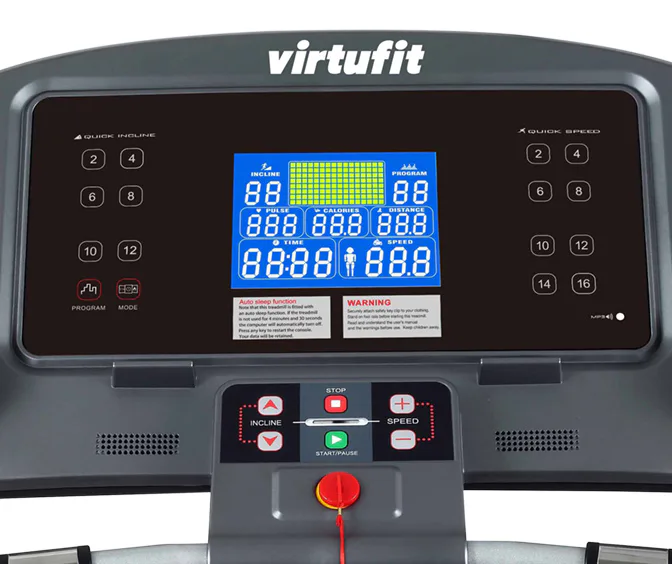 Běžecký pás VIRTUFIT Elite TR-900i je vybaven motorem o max. výkonu 7 HP / trvalý 3 HP s nastavením rychlostí v rozmezí 1 až 20 km/h. Prostorná běžecká plocha o rozměrech 55 x 153 cm. Sklon pásu je možné regulovat do 15 %. Elektronická regulace umožňuje nastavení rychlosti a sklonu pomocí tlačítek umístěných v madlech běžeckého pásu.