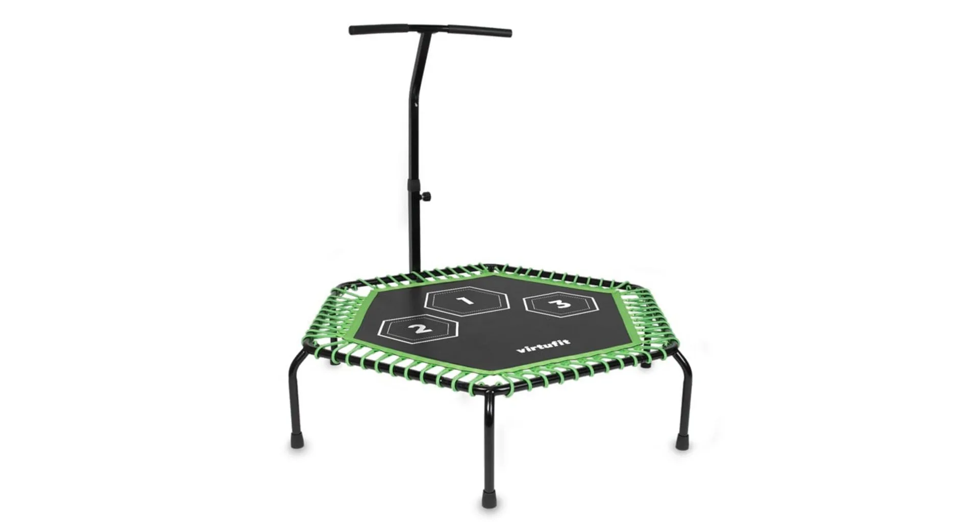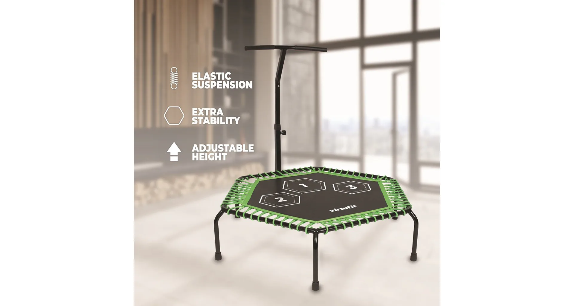 VIRTUFIT Fitness Pro s madlem je ideální volbou pro domácí kondiční trénink. Skákání na trampolíně efektivně zlepšuje fyzičku, rovnováhu a posiluje hluboké stabilizační svaly, a přitom šetří klouby. Díky nastavitelnému madlu získáte větší oporu při náročnějších cvicích nebo při rehabilitačním cvičení.