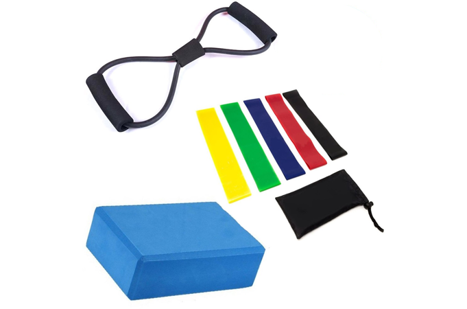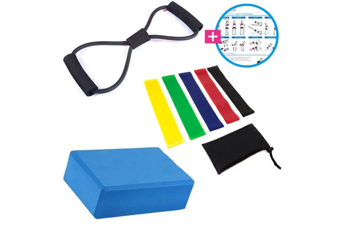 VirtuFit Fitness & Yoga Fit Package je sada na cvičení, která obsahuje odporové gumy, osma expender, blok na jógu a tréninkový manuál.