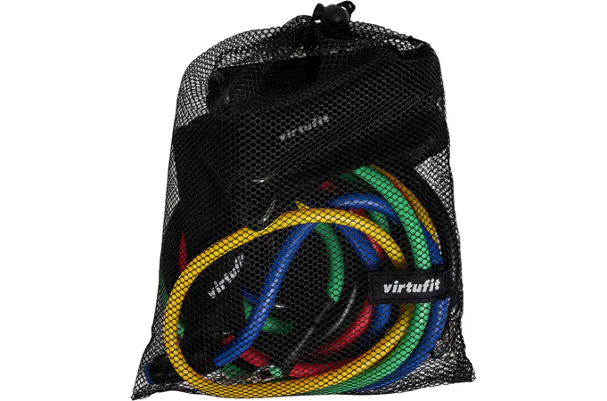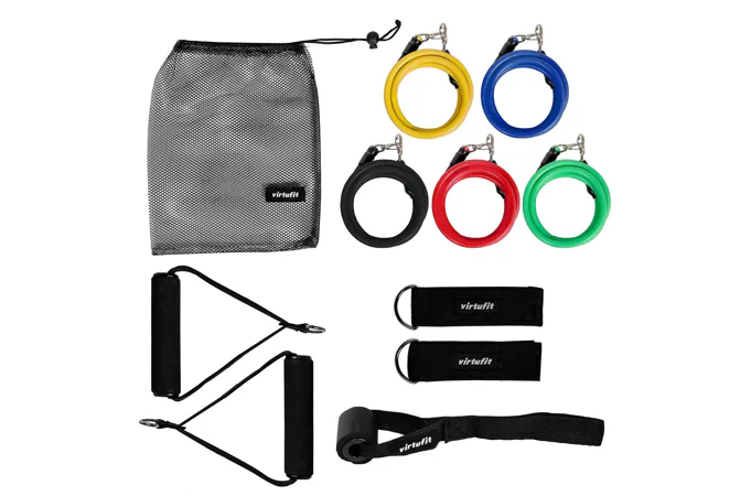 Sada cvičebních gum VirtuFit Resistance Kit - 11 je ideální pro trénink s odporem s možností tuhosti expanderu. VirtuFit Resistance Kit obsahuje: 5x odporová guma, 2 - úchyty na ruce, 2 - úchyty kotníku, 1 - upevnění na dveře. Každá dvojice gum má jinou tuhost, která vám umožní vybrat různé úrovně intenzity cvičení. Na každé z gum může být rukojeť, což umožňuje realizaci komplexního tréninku všech svalových skupin.