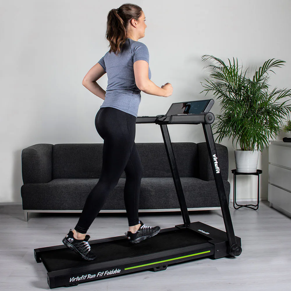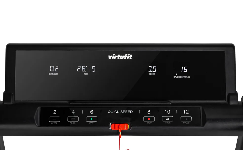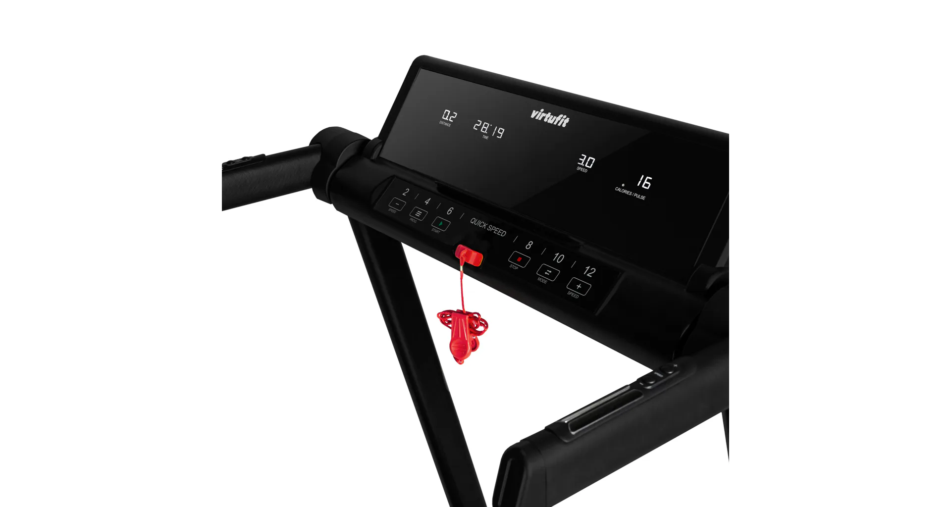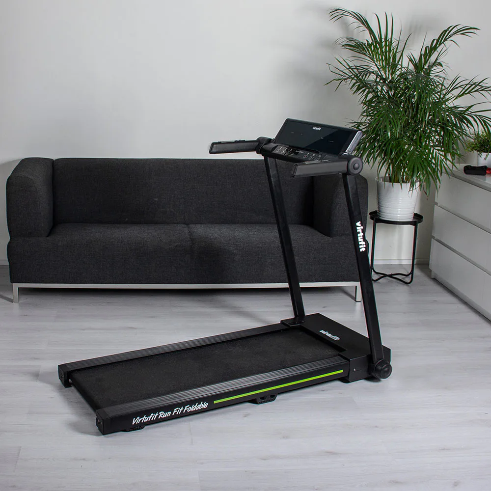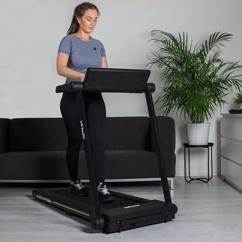 Běžecký trenažér VIRTUFIT Run Fit skládací je moderní, velmi dobře skladný běžecký pás, který je díky svým kompaktním rozměrům ideální volbou pro kondiční trénink v domácím prostředí. Pro maximální komfort je možné sklopit sloupky s konzolí a trenažér schovat například pod postel.