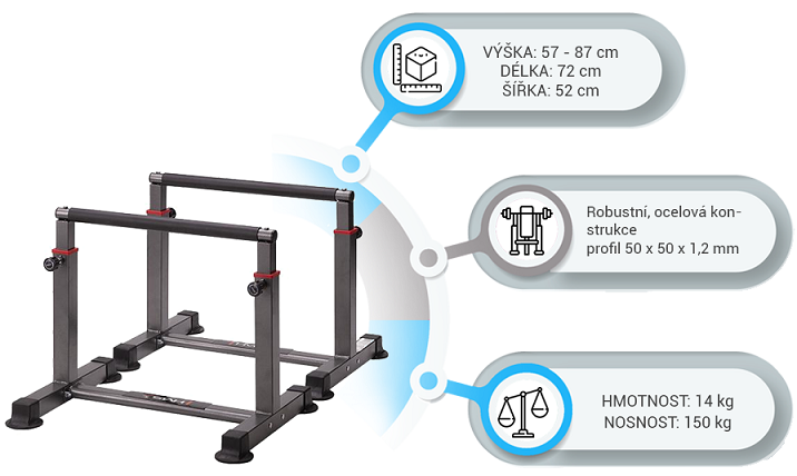 Výškově nastavitelná bradla HMS PW30 Pro jsou profesionální nástroj pro trénink s vlastní váhou a ideální uplatnění najdou například při CrossFit tréninku. Bradla umožňují provádět nejrůznější cviky přes klasické kliky, dipy, švédské kliky až po stojky. Na podpěrách cvičíme s vlastní váhou. Bradla jsou tak vhodná jak pro profesionální cvičence, tak pro začínající juniory. HMS PW30 Pro jsou výškově nastavitelné v rozmezí 57 - 87 centimetrů a jejich možnost použití se tak ještě rozšiřuje. Výšku podpěr si tak můžete jednoduše přizpůsobit potřebám konkrétního cviku.