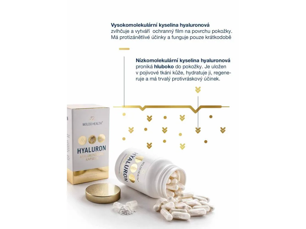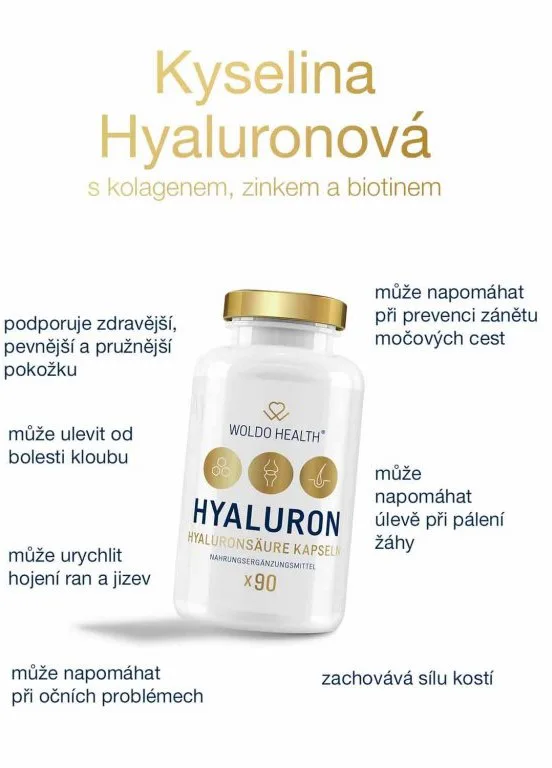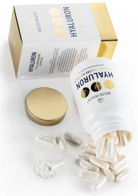WoldoHealth® Hyaluronová kyselina má příznivý účinek na hydrataci pokožky, stimulaci a růst nových buněk a omezení tvorby vrásek. Má také velký vliv na správnou funkci kloubů. Je nezbytnou součástí synoviální tekutiny, což je vazká tekutina zabezpečující hladký pohyb kloubů a zamezující jejich nadměrnému tření. Má schopnost nést živiny do chrupavky a odvádět odpadní látky z kloubního pouzdra.