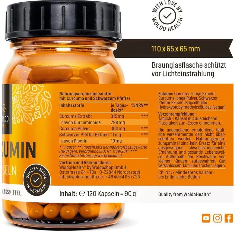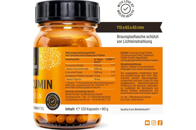 Obsah účinných látek: V jedné denní dávce WoldoHealth® Kurkumin s piperinem (1 kapsle) získáte 315 mg extraktu kurkumy z toho 299 mg kurkuminoidy a 300 mg prášku z kurkumy. Jedna denní dávka také obsahuje 11mg extraktu černého pepře a z toho 10mg piperinu.