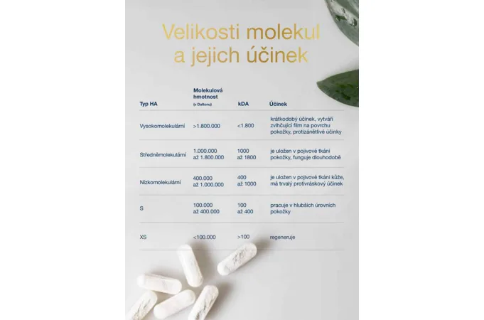 Existují 3 formy kyseliny hyaluronové. Nízkomolekulární, středněmolekulární a vysokomolekulární. Doporučená je kombinace mezi nízkomolekulární a středněmolekulární (přibližně kolem 600 kDa), protože molekuly jsou schopny projít jak klouby tak pokožkou. Kyselina hyaluronová WoldoHealth obsahuje vysoké množství 500 mg kys. hyaluronové o molekulární velikosti 500-700 kDa. Dle posledních vědeckých studií se považuje právě molekulární velikost 500-700 kDa za optimální.