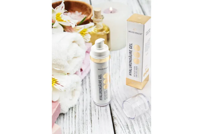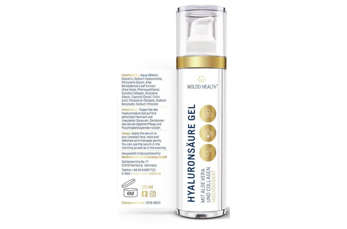 WoldoHealth® Kyselina hyaluronová sérum, s vysokým obsahem aloe vera a kolagenu. V séru je použita kombinace kyselina hyaluronové ve formě hyaluronátu sodného a 100% hovězího kolagenu. Sérum je dodáváno v 50 ml lahvičce, která díky dvojitému obalu chrání produkt před přímým slunečním světlem. Dávkovací pumpička zajišťuje přesně cílenou dávku séra při každém použití. Sérum hydratuje a vyživuje pokožku, omlazuje pleť a dodává jí cennou výživu.