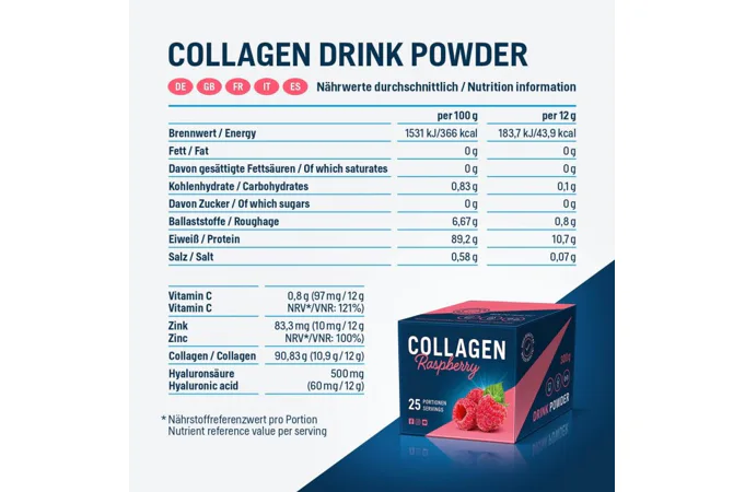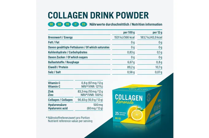 Hydrolyzované hovězí kolagenové peptidy, kyselina citronová, hydrolyzovaný rybí kolagen, citronové aroma, barviva: betanin, kurkumin; kyselina L-askorbová (vitamin C), chlorid sodný, kyselina hyaluronová, sladidla: acesulfam K, sukralosa; oxid zinečnatý.