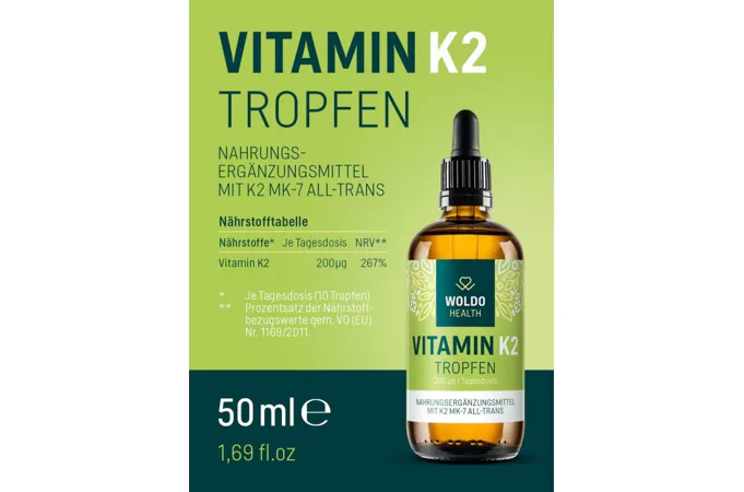 Vysoce koncentrovaná dávka vitamínu WoldoHealth® Vitamín K2 MK7 v patentované formě jako K2VITAL®DELTA od německé společnosti Kappa BioScience. V 10 kapkách z naší 50 ml lahvičky získáte 200 μg vitamínu K2 v jeho MK7 formě. Patentovaná forma vitamínu K2 jako MK7 je považována za nejaktivnější a nejčistší formu vitamínu K2. Vitamín K2 je rozpuštěn v 100% MCT kokosovém oleji pro lepší vstřebávání a dodáván v balení z jantarového skla, která slouží k ochraně před UV zářením a zajišťuje optimální trvanlivost.