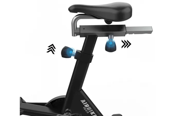Trenažér Air Bike XEBEX Air Bike 1000 má kvalitní ergonomicky tvarované sedlo, které je nastavitelné v horizontálním i vertikálním směru. Pohyblivá madla rukou jsou spojena s pedály a přináší tím zapojení horní i spodní části těla.