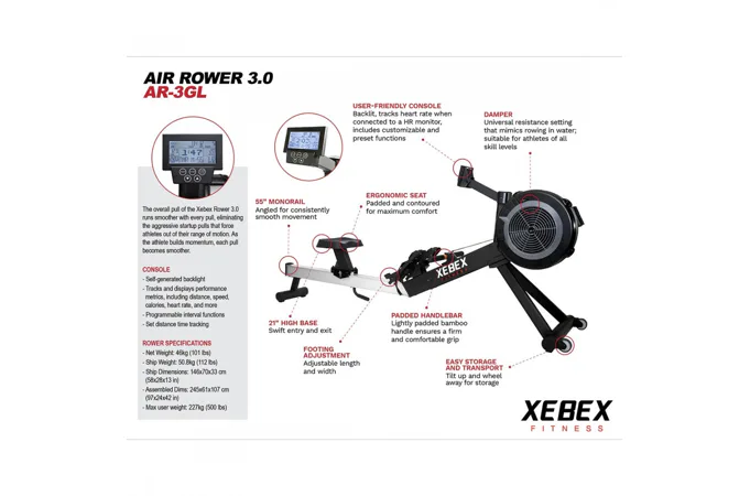 XEBEX Air Rower 3.0 Smart Connect patří ke špičkovým, komerčním veslovacím trenažérům s dlouholetou tradicí. Tento model nabízí to nejlepší co si můžete pro domácí, ale i plně komerční veslování přát a to zejména v oblasti prvotřídní kvality, robusní konstrukce, komfortu veslování i inovativního designu.