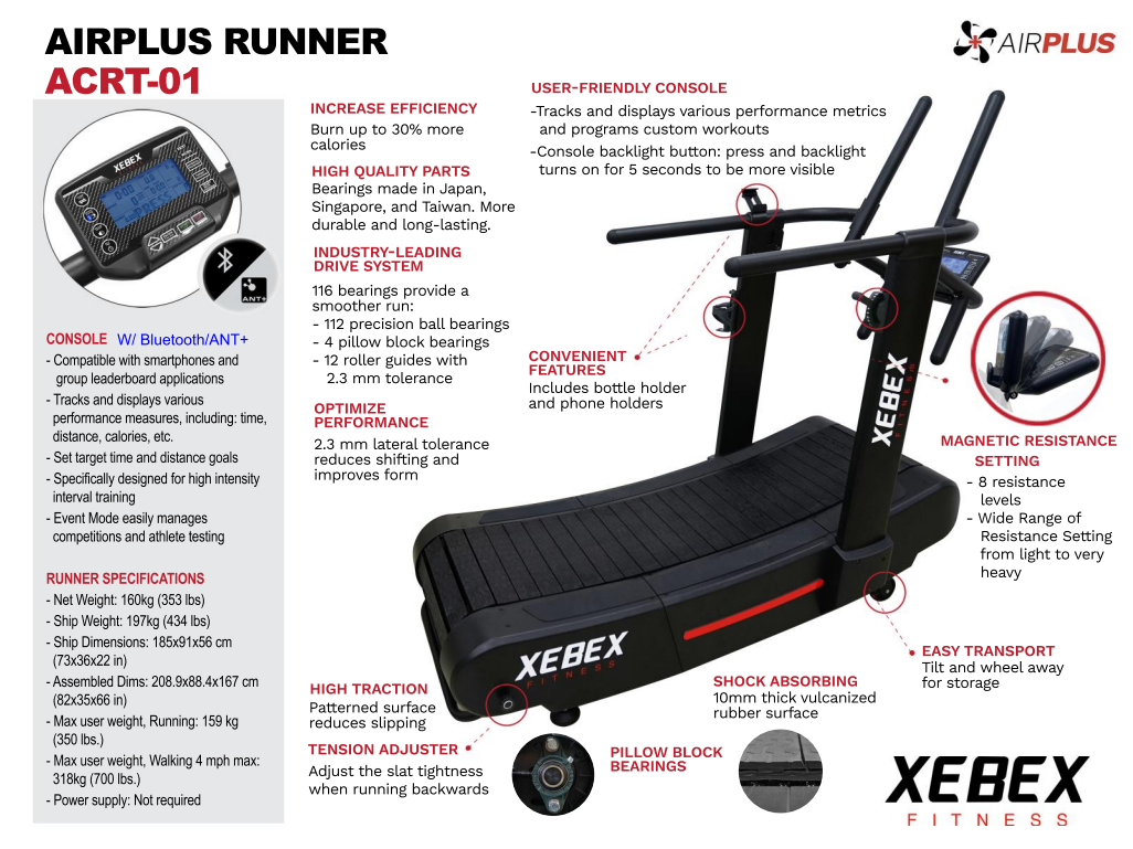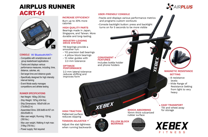 Tento lamelový trenažér s možností nastavení úhlu XEBEX AirPlus Runner Smart Connect 2.0 amerického výrobce, představuje naprostou špičku mezi běžeckými pásy. Jedná se o inovativní systém běžeckého trenažéru s lamelovou kurtou, který je ideální pro dynamiku sprintů a rozvoj vytrvalosti, výbušnosti.