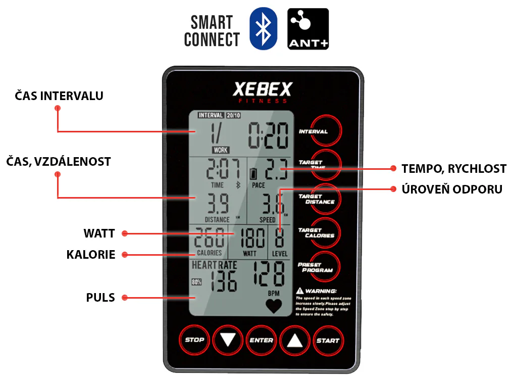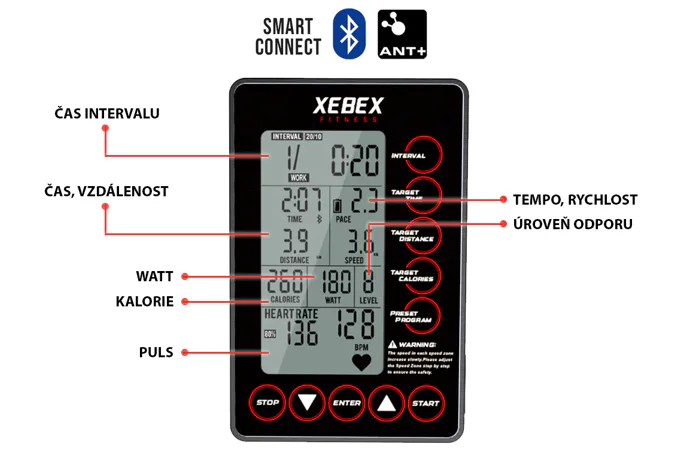 Díky Funkci Smart Connect můžete přes Bluetooth připojení spárovat trenažer XEBEX k vašemu tabletu, nebo smartphonu a používat tak při tréninku různé aplikace. Interaktivní trénink s přáteli? Skupinové závody? Personalizované tréninkové plány? Extra data a historie tréninku? Živé kurzy nebo kurzy na vyžádání? Se systémem Smart Connect, to není žádný problém.
