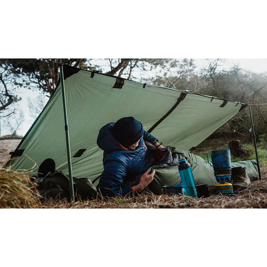 Velká voděodolná plachta, kterou lze natáhnout přes šňůru nebo napnout na tyčky. Zesílené švy okolo háčků, očka, upínací druky pro spojení více plachet. Odolnost proti vodě: 2000 mm.