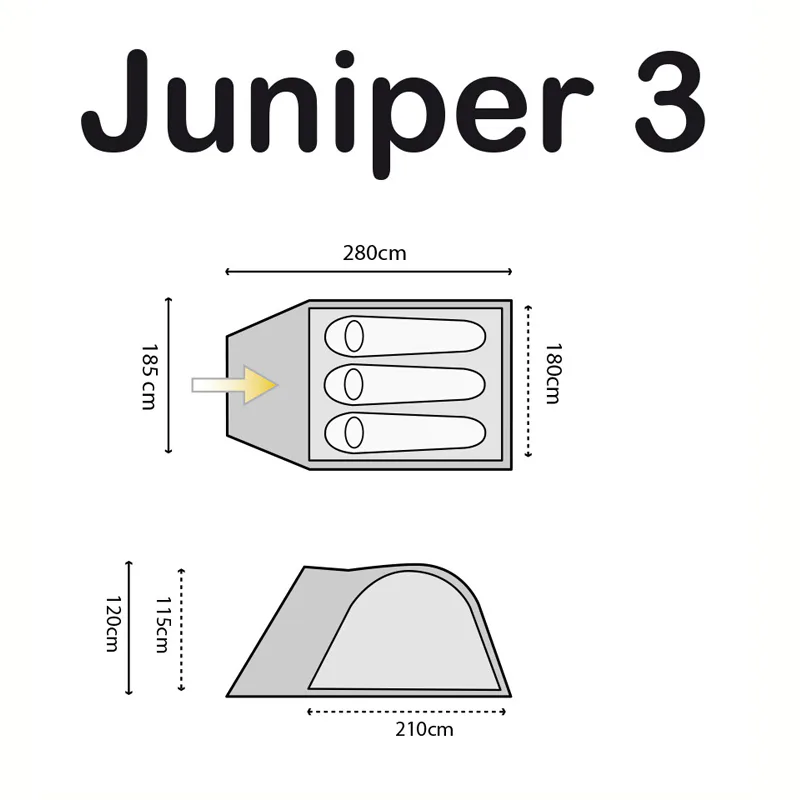 Stan YATE HIGHLANDER Juniper 3 poskytuje dostatek místa pro osoby i zavazadla. Velký vchod a vnitřní výška 115 cm poskytuje dostatek pohodlí. Samonosná konstrukce zajišťuje dobrou stabilitu ve větru. Vhodný pro turistiku a kempink.