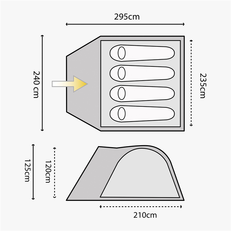 Stan YATE HIGHLANDER Juniper 4 poskytuje dostatek místa pro osoby i zavazadla. Velký vchod a vnitřní výška 120 cm poskytuje dostatek pohodlí. Samonosná konstrukce zajišťuje dobrou stabilitu ve větru. Vhodný pro turistiku a kempink.