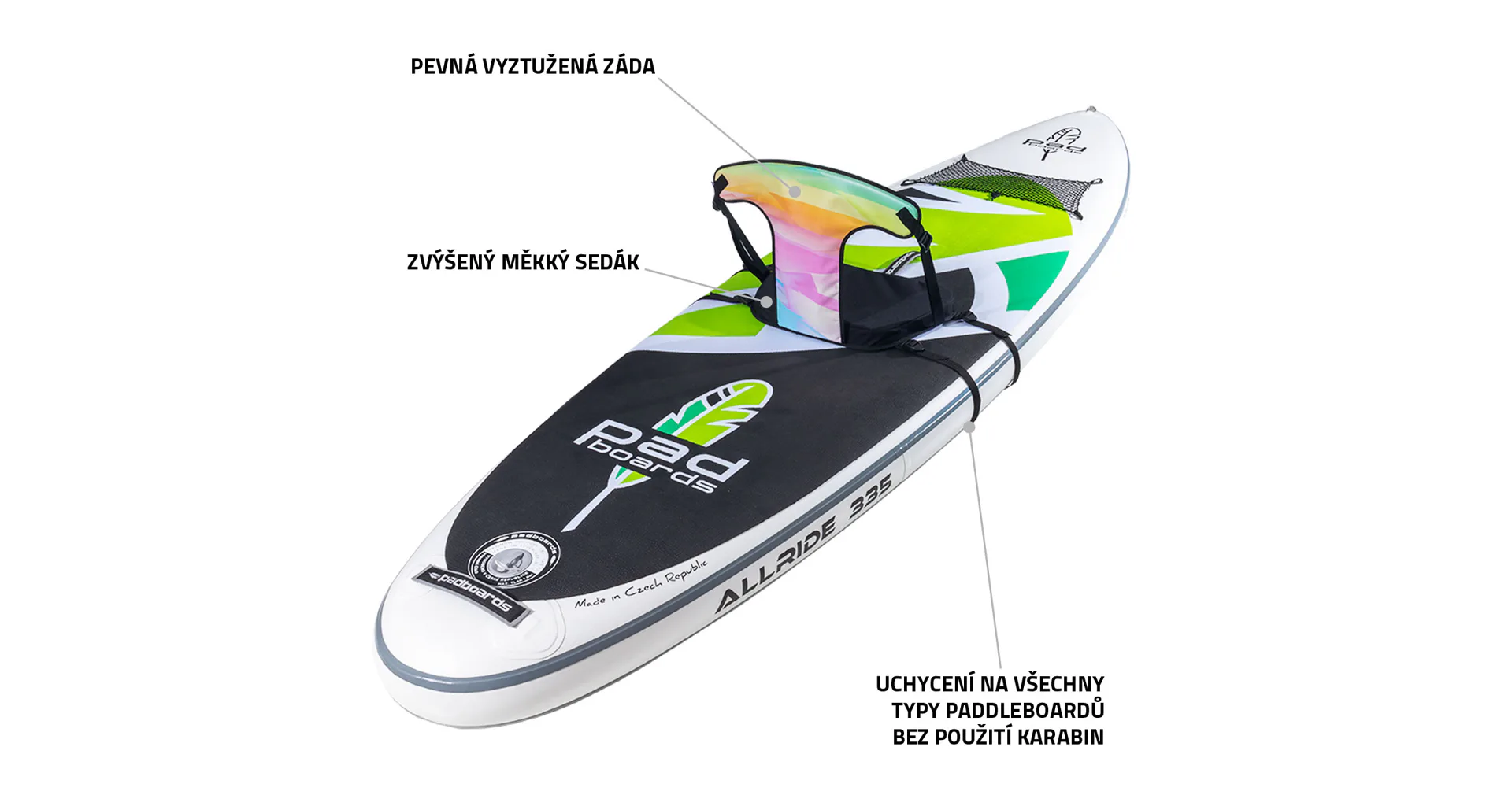 Sedačka pro paddleboard YATE MIDI, je univerzální sedačka pro všechny typy paddleboardů. Jedná se o odlehčené ekonomické provedení komfortního modelu MAXIM. Tato sedačka umožňuje praktické upevnění k paddleboardu BEZ POUŽITÍ KARABIN - prkno nemusí být vybaveno upínacími oky. Díky tomu je použitelná na všechny typy paddleboardů včetně jógových, která obvykle oka nemají. S variabilním uchycením se může sedačka umístit v libovolné části prkna a tento systém také umožňuje UMÍSTĚNÍ VÍCE SEDAČEK NA JEDNOM paddleboardu. Zpevněná opěra zad umožňuje pohodlné sezení a nesklápí se. Zvýšený sedák zajišťuje větší pohodlí.