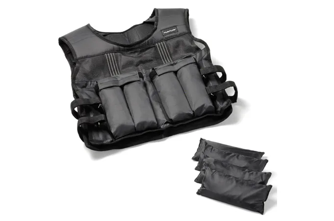 Zátěžová nylonová vesta od značky TUNTURI se zátěží 10 kg je praktická pomůcka s variabilní hmotností. Povrch vesty tvoří pohodlný nylon, výplň pak představuje 8 segmentů plněných jemným pískem (jeden váží 1,25 kg). Pruh síťoviny vpředu i vzadu napomáhá lepší prodyšnosti vesty. Pro přizpůsobení velikosti dle postavy a pro lepší fixaci vesty slouží dva pásy na suchý zip na každé straně. Zátěžová vesta nachází uplatnění při běhu, cvičení s vlastní hmotností a dalších disciplínách. Cvičení s vestou zvyšuje dynamiku, vytrvalost i aerobní kapacitu.