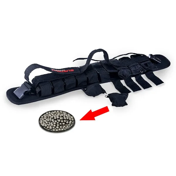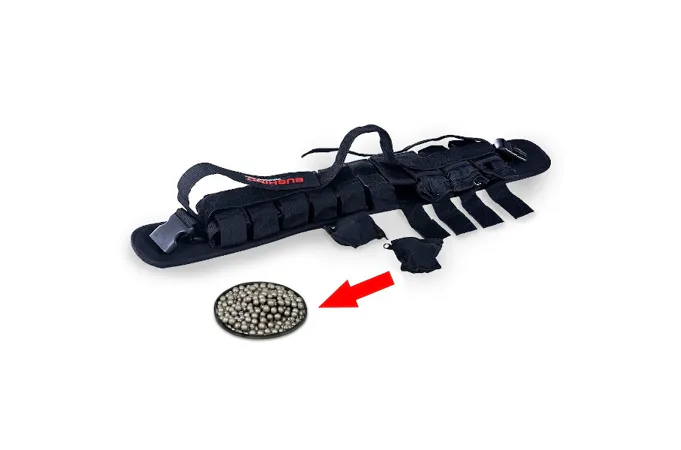 Regulace hmotnosti se provádí pomocí 10-ti kapsiček na široký, suchý zip, do kterých se nasypou kovové čočky.