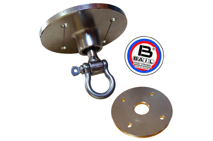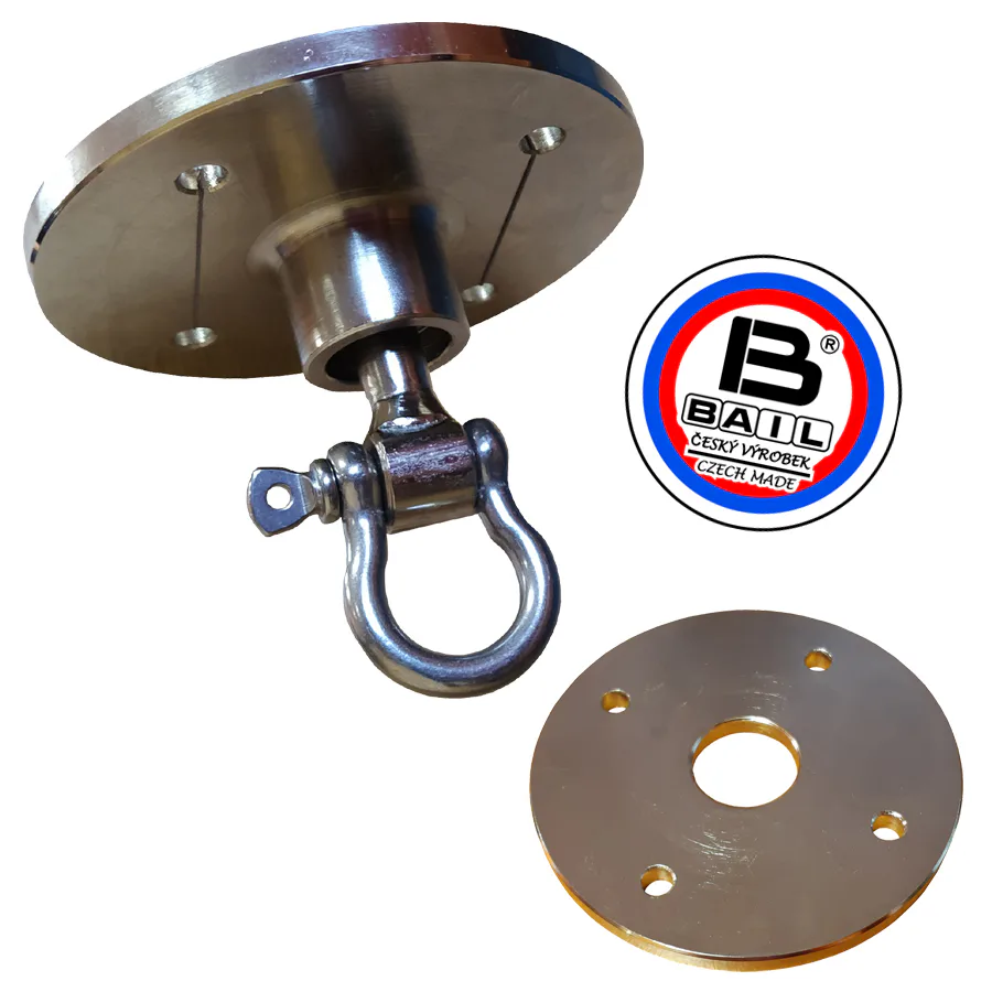 Kvalitní závěs otočný ložiskový BAIL na boxovací hrušku tuzemské výroby pro boxovací hrušky s otočným okem zabraňující vytrhávání ze stropu (během tréninku se u neotočných úchytů přenáší rázy na úchyt). Je přizpůsoben potřebám cvičení nejen svými rozměry, kvalitní povrchovou úpravou, ale i estetickým a praktickým vzhledem.