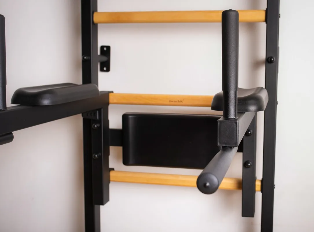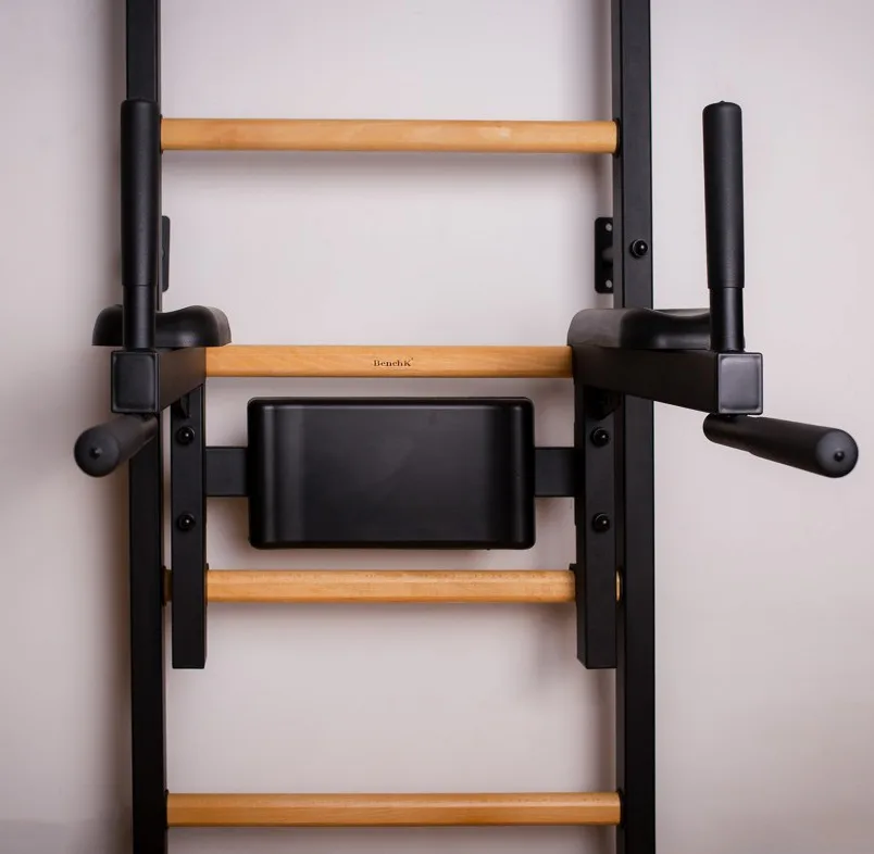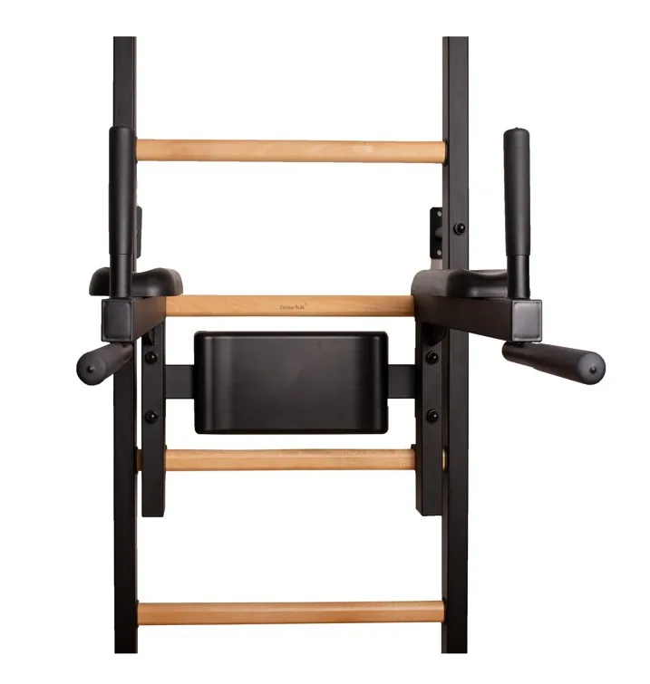 Závěsná bradla BenchK DB3B určená pro žebřiny BenchK 310B jsou připevněna ke 4 háčkům o tloušťce 4 mm s plstěnou podložkou, aby nedošlo k poškrábání dřevěných příček. Opěrka zad a loketní opěrky jsou vyrobeny z polyuretanové pěny na moderních strojích, což zaručuje dlouhou životnost a snadnou péči. Nedílnou součástí jsou i čtyři úchopová madla, která jsou protiskluzová a příjemná na dotek.