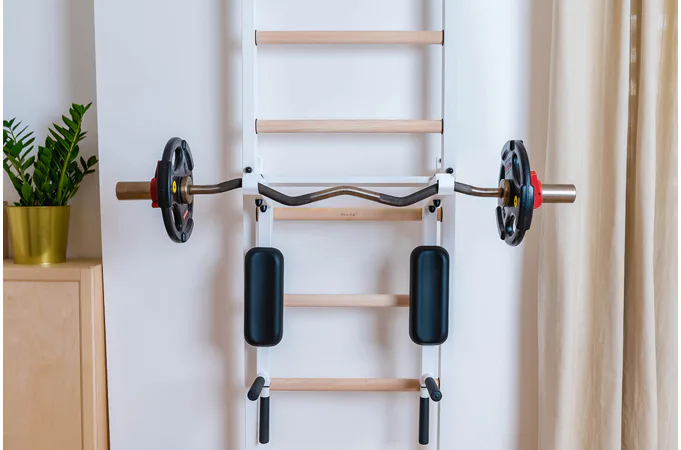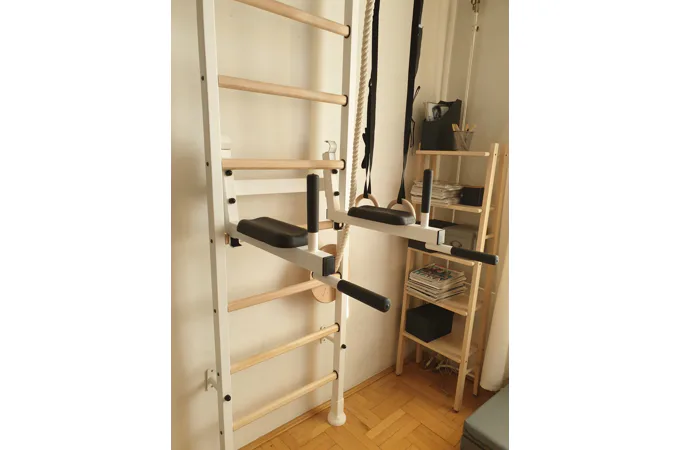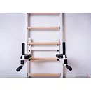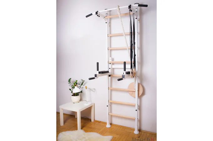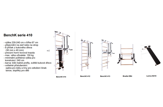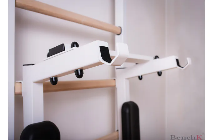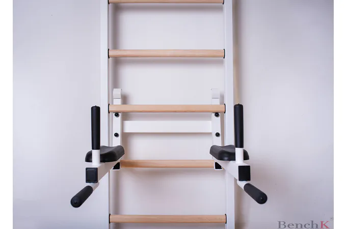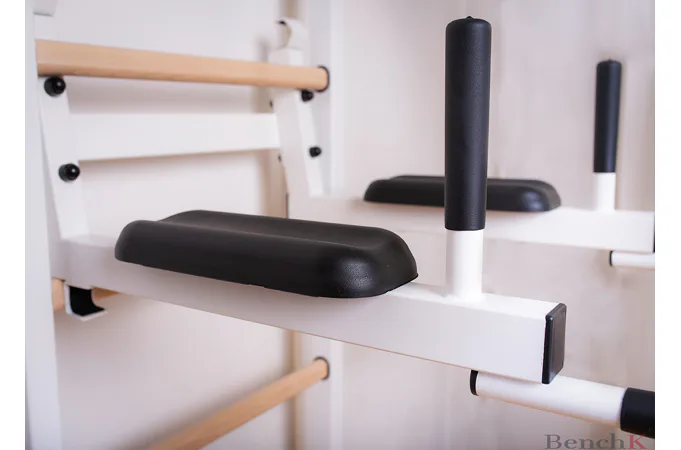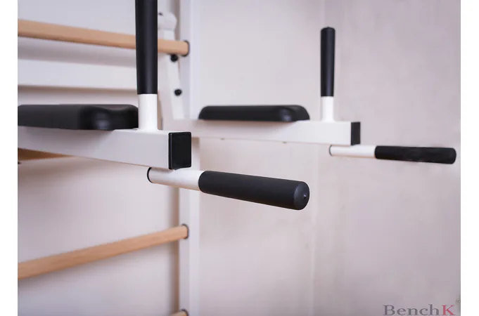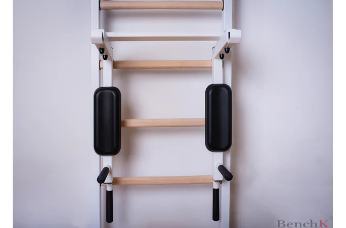 Závěsná bradla BenchK DB4 určená pro žebřiny BenchK 412 jsou připevněna ke 4 háčkům s plstěnou podložkou, aby nedošlo k poškrábání dřevěných příček. Opěrka zad a loketní opěrky jsou vyrobeny z polyuretanové pěny na moderních strojích, což zaručuje dlouhou životnost a snadnou péči. Nedílnou součástí jsou i čtyři úchopová madla, která jsou protiskluzová a příjemná na dotek.